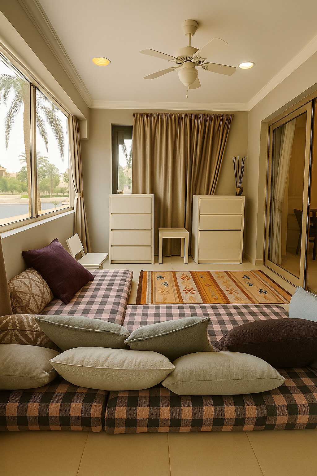 Stay 10 Nights & Enjoy a Free Felucca Nile Ride! Uptown Cairo city center, perfect for business or leisure. Our newly refurbished property boasts a bright, cozy layout with large windows and stunning golf & city views. Inside, a comfy living & dining area, a modern kitchen with high-end appliances, elegant bedrooms with en-suite bathrooms, and a versatile study/office. Just steps away, get free access to a gym, swimming pool, jacuzzi, lounge, and children's playground.