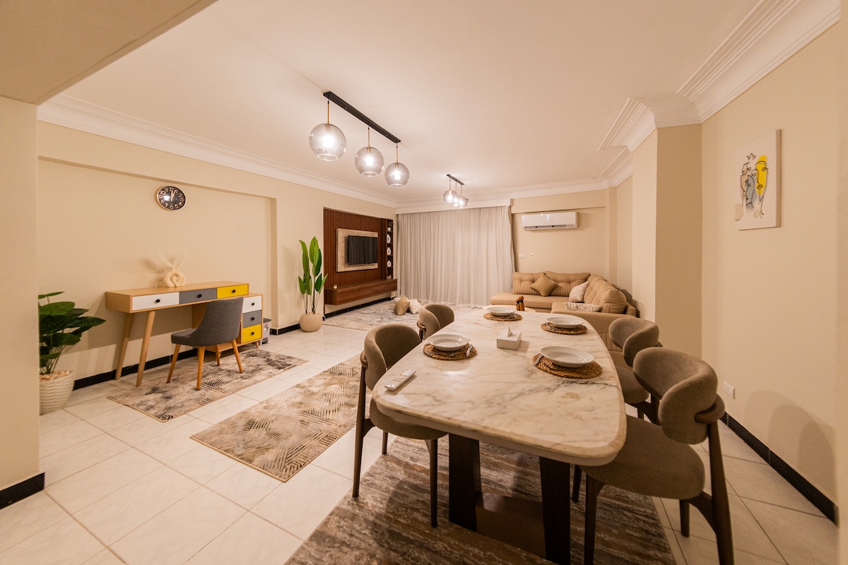 Beautifully designed luxury apartment . Private floor 2400 sq ft . A perfect getaway for family/individuals looking for neat well furnished stay in Ard El Golf- Heliopolis Cairo. A panoramic garden view along with sunshine specious area served with fully air conditioning (cold and heat). Inspired high standard amenities. Welcoming neighborhood. Metro station is 8 mints walking distance, Famous shopping malls and groceries are quite near. All over, nothing is better than a unique safe location.