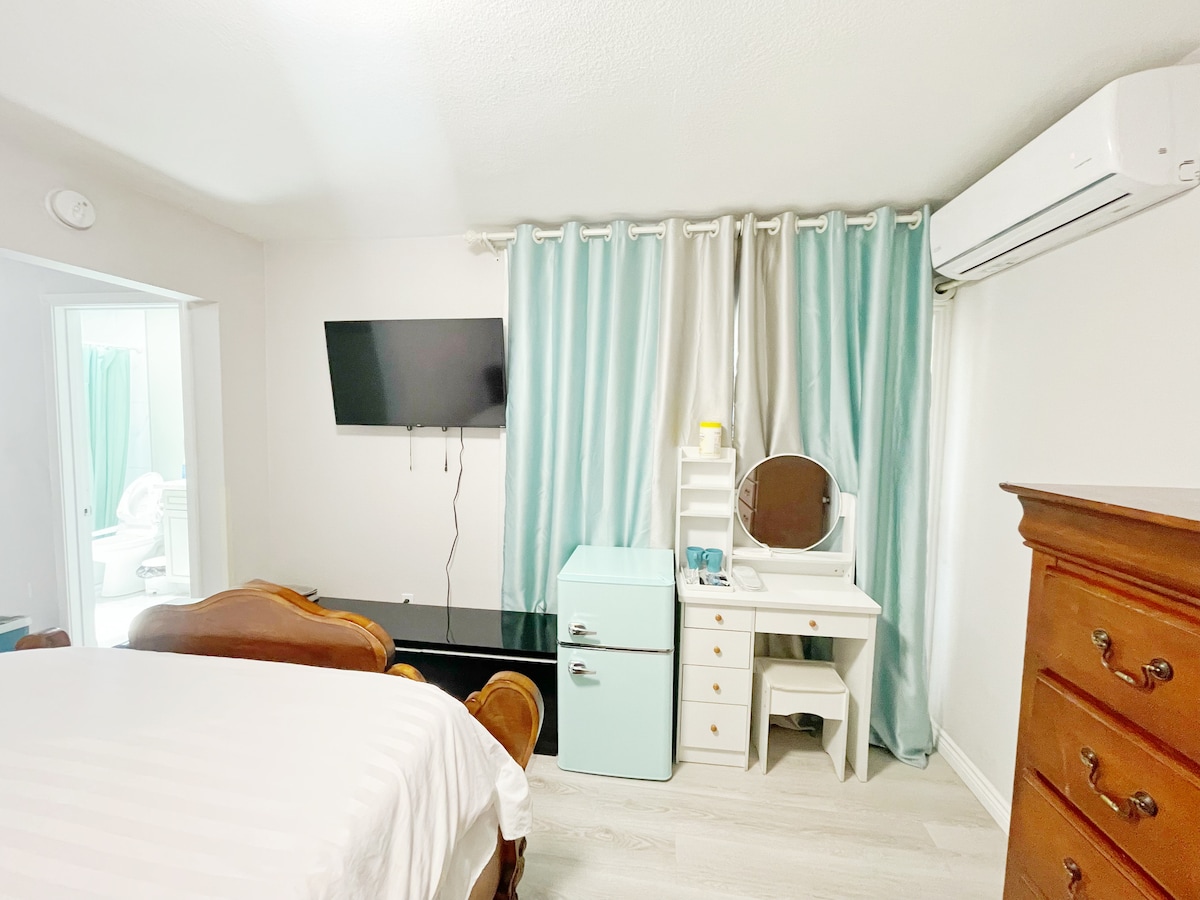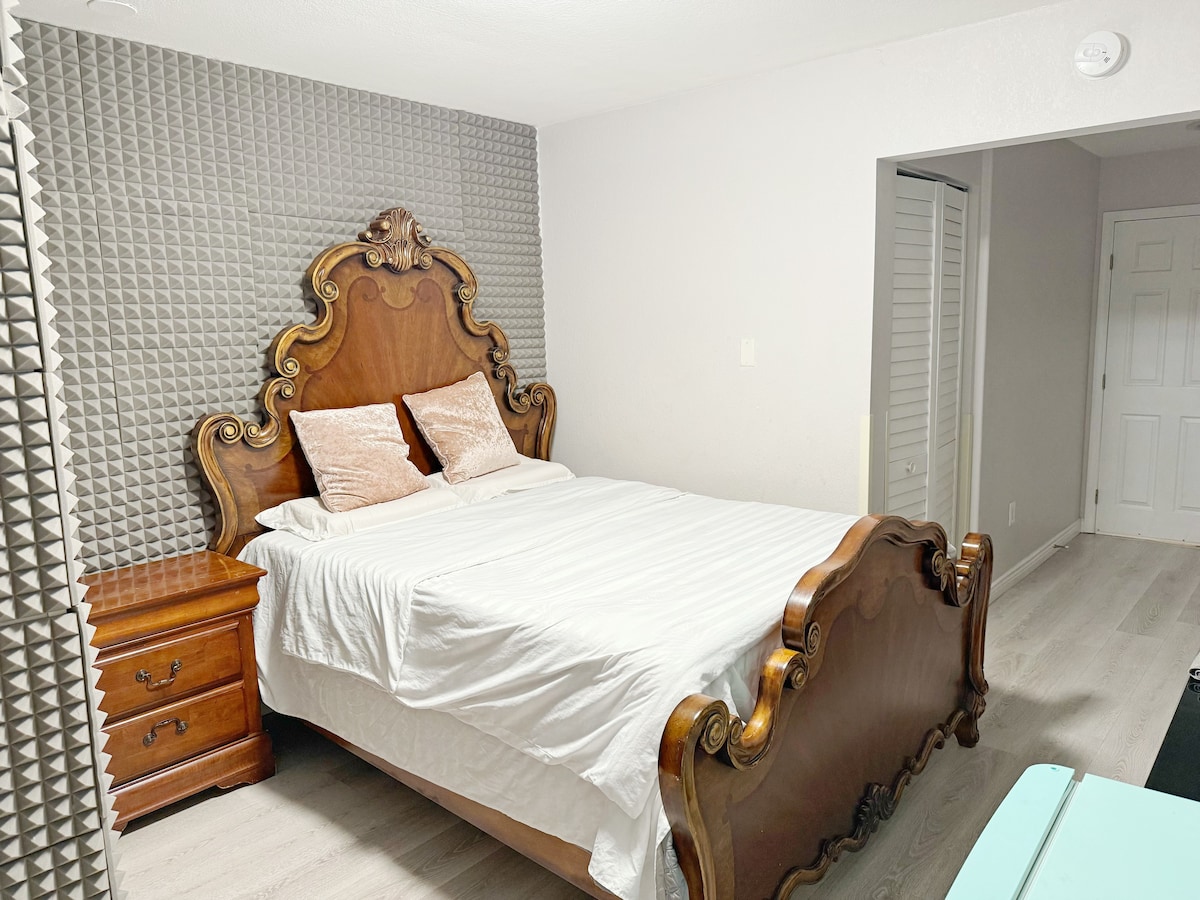 Welcome to your stylish and convenient studio apartment nestled in South El Monte This cozy space offers minimalistic living with a touch of comfort, perfect for those seeking a hassle-free lifestyle. Key Features: Kitchenette: Fully equipped with various appliances and some ingredients for simple meals. Bedroom Area: Private and inviting, with a queen-sized bed and nightstands for your convenience. Bathroom: Spacious and peaceful, packed with toiletries and an LED Mirror great for selfies