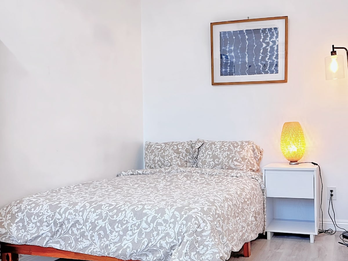 Quiet and cozy standalone guesthouse with private entrance and self check-in. No contact with other guests, no spaces are shared — everything is entirely for your private use. Features a queen-size bed ideal for couples, an additional sofa bed can be provided for the third guest to sleep on. A/C and heating, work desk, fan, and smoke detector. Enjoy a private kitchen for light cooking, a walk-in shower, and blackout curtains for restful sleep. Large windows provide plenty of natural light.