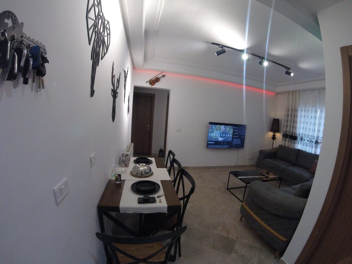 Agréable appartement bien situé dans un charmant quartier résidentiel,joliment meublé et bien équipé, à 10 minutes de I’aéroport L'appartement se compose d'une cuisine bien équipée et de tout le nécessaire pour cuisiner et faire de bons petits plats maison, deux chambres complètent ce logement, dont l’une avec suite. l’appartement possède une vue dégagée et agréable sur grand Tunis et située au 5 ème étage avec double ascenseurs. nous somme ravis de vous accueillir avec notre co-hote Mehdi
