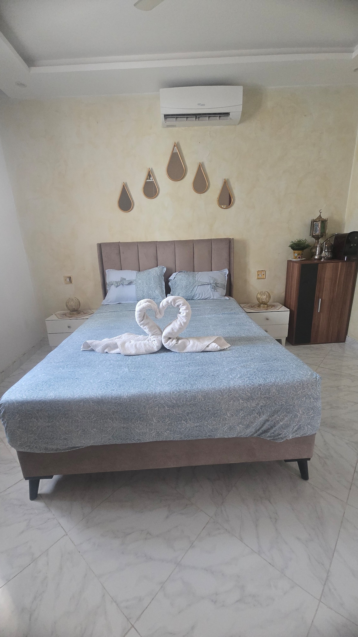 un merveilleux appartement s+2 de très haut standing situé en plein centre ville de Tunis et proche de toutes commodités.à 10 min de l’aéroport .parking gratuit et gardé avec ascenseur .l'appartement est composé d'une chambre à coucher avec un grand dressing salon salle à manger , séjour arabesque, salle de bain avec jacuzzi, cuisine bien équipée avec four plaque ,machine à laver automatique et micro onde , l'appartement est chauffé et climatisé .linges de Lit , draps et serviettes disponibles