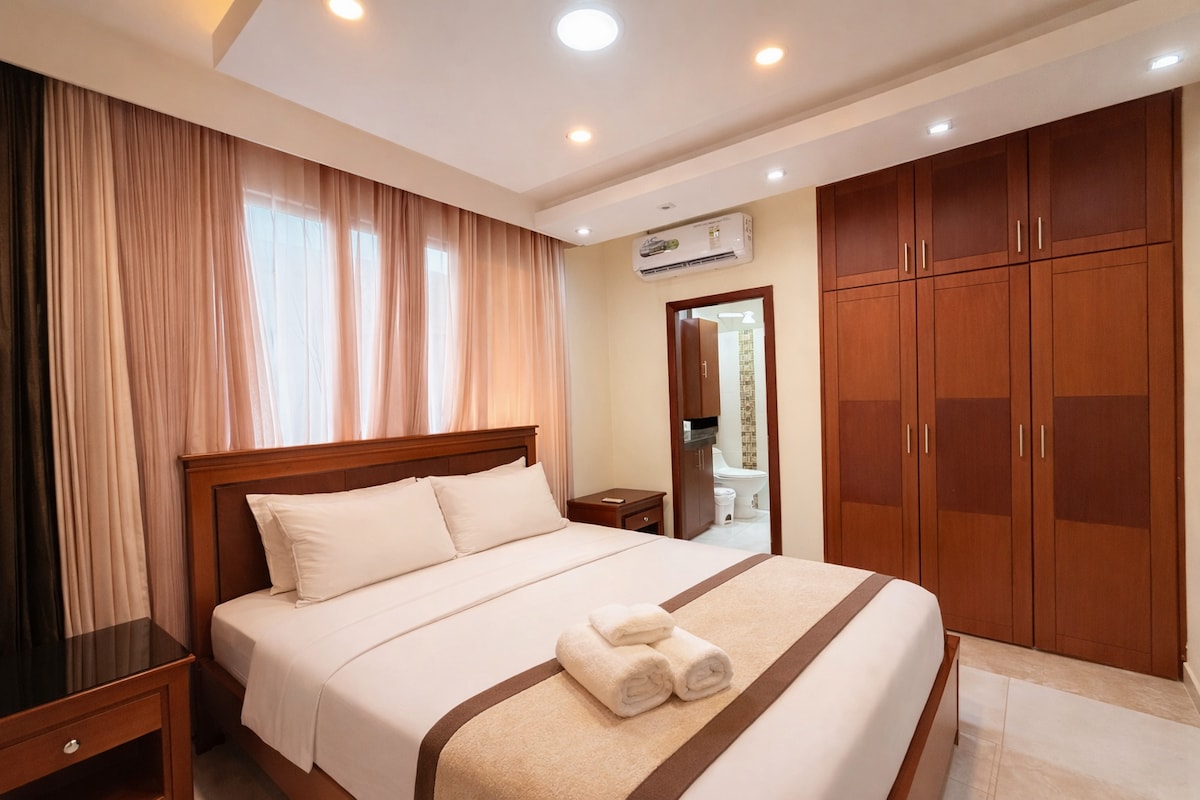 Relájate en una suite cálida y elegante pensada para parejas. Disfruta una cama amplia, iluminación suave, Smart TV gigante y una decoración en madera que crea un ambiente íntimo y relajante. La cocina está equipada para preparar algo especial, y también podrás disfrutar de la piscina y áreas exteriores tranquilas. Ubicación exclusiva en Unioro, cerca de restaurantes y zonas seguras para caminar en pareja.