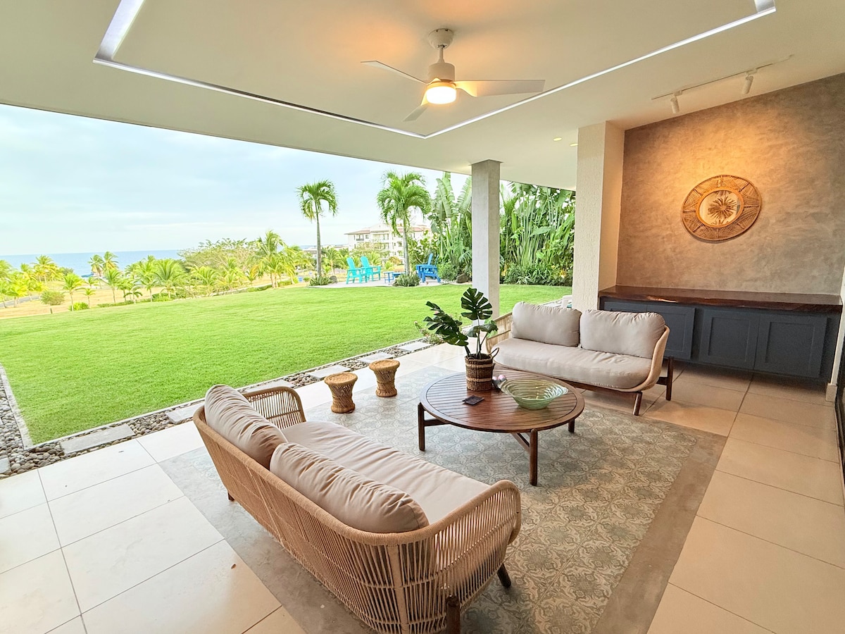Lindo apartamento frente al mar , con todas comodidades, espacios elegantes y confortables. Contenido: dos recamaras totalmente independientes dos baños con duchas Cocina completamente equipada centro de lavado gratis Aires acondicionados en todas las habitaciones dos salas, una en el balcón con vista panorámica y otra sala con TV Amplio, acogedor balcón privado con tumbona frente al mar wifi Área de BB y piscinas Muy cerca de la escuela de Surf y restaurantes locales e internacionales.