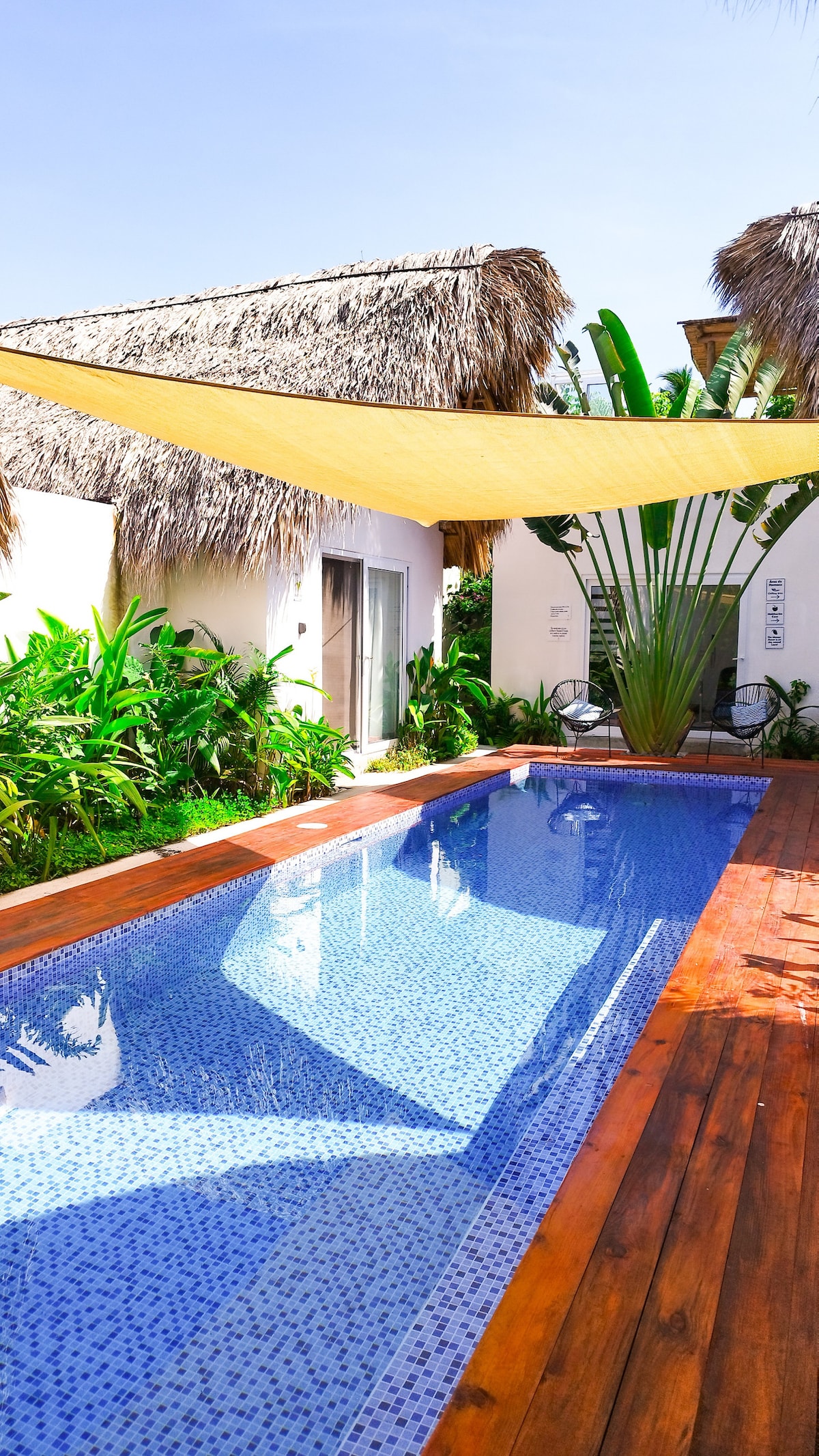 Place to relax and chill, with four distinct houses that represent each one of the elements: fire, wind, earth and water. Each house is complete with two bedrooms, one bathroom, kitchen, and a small pool that connects to the living area. All surrounded by a wooden deck and plenty of nature. An outdoor shower, yet private surrounded by nature to cool off from a relaxing day at the beach.