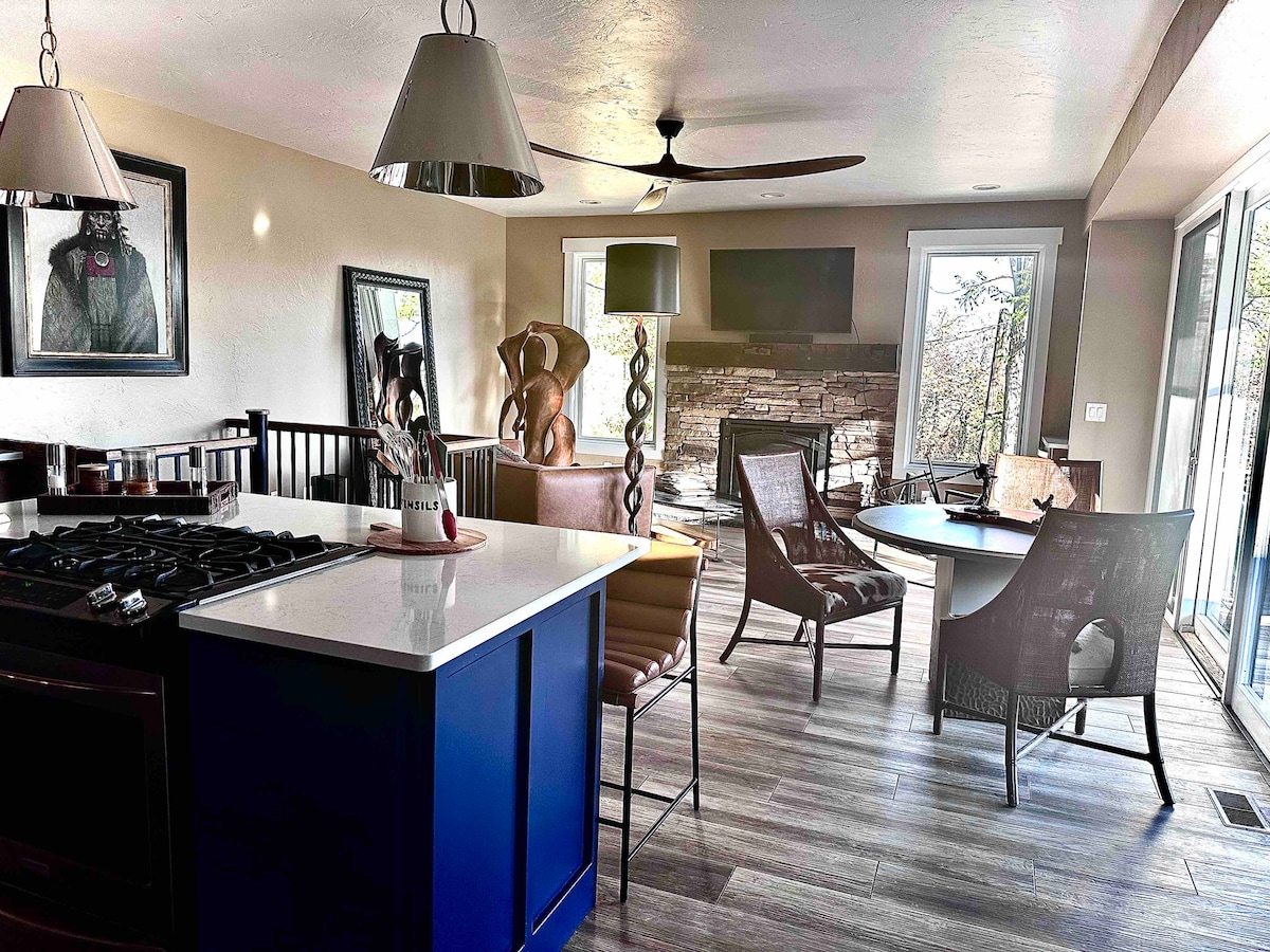 There’s a river in the backyard next to the private hot tub and sauna, what more could you need?! If you love watching local wildlife, listening the sound of the creek with a cup of coffee in hand, and relaxing on a luxurious back patio that’s perfect for all seasons, then you should probably book here. Enjoy the full amenities of a kitchen stocked with a curator’s touch, heated towel rack, remote control gas fireplace,top-to-bottom remodel. Book RiverHouse South before someone beats you to it!