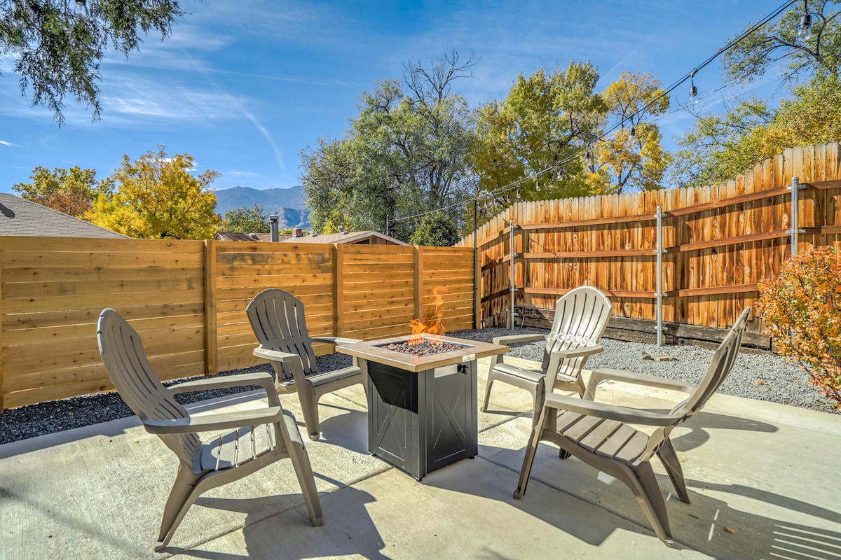 Gorgeous back yard is fully fenced. Enjoy a night around the fire after a big day of exploring, or relax in a hammock chair dreaming up the next day’s plans! The house is by no means huge, but cozy, appointed with comfy and attractive furnishings and decor, and has everything you need for a great stay in CO Springs. 5 minutes to great mtn biking at Palmer Park 12 to down town or Old Colorado City 14 to Garden of the Gods, 20 to Manitou Springs 5 to UCCS , 8 to Colorado College STR-2297
