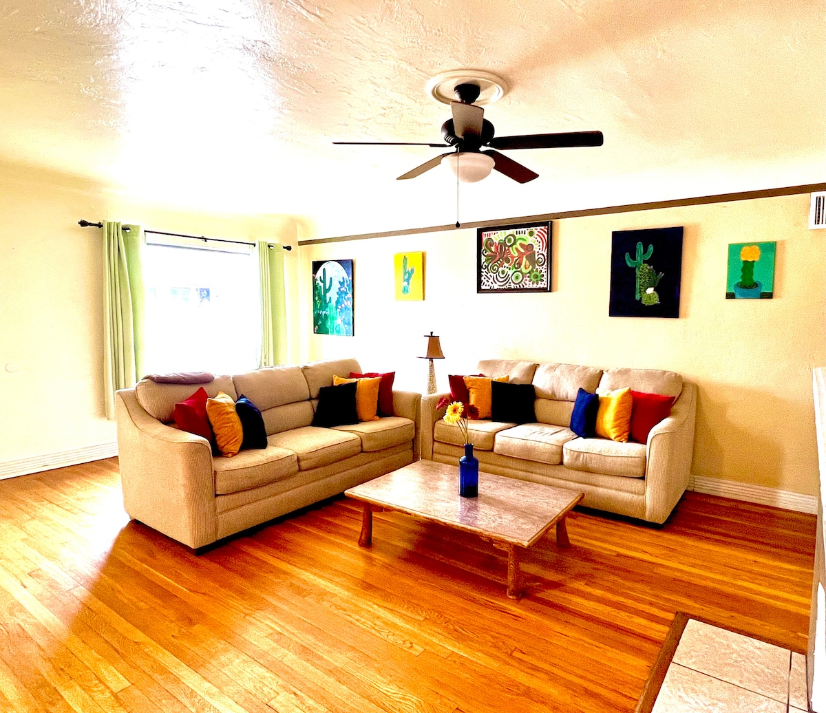 Experience the vibrant Mexican-American culture and its warm hospitality in this updated, open-concept home. Whether you're in town to work, relax, or play, this spacious 3 BR/2 BA home with game room, 500+Mbps, refrigerated AC, king suite & gourmet kitchen has it all. Relax by the fire table or hammock pergola in the NEW backyard retreat w/basketball court & pickleball! Close to I-10, airport, UTEP/UMC/downtown/FtBliss/HuecoTanks/eats/parks/shops. We look forward to welcoming you. ¡Bienvenidos!