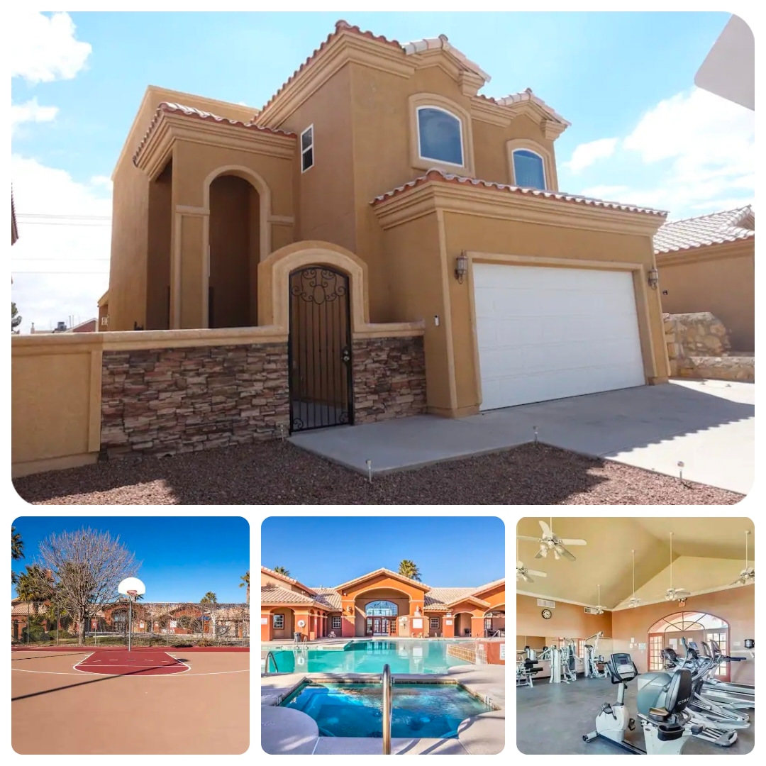 Forget your worries and escape to this spacious and serene space. This home in a gated community near Ft. Bliss features 1,620 SQFT, 3 BR, 2.5 BA .Master suite with king bed, large bathroom with a jetted tub and walk-in closet. Enjoy a large family room with an oversized TV, dining room, and a fully equipped kitchen. The community offers a playground, workout center, pool, hot tub, tennis, and basketball court for your leisure. 15 mins to Cielo Vista Mall, restaurants, 13 mins to the airport.