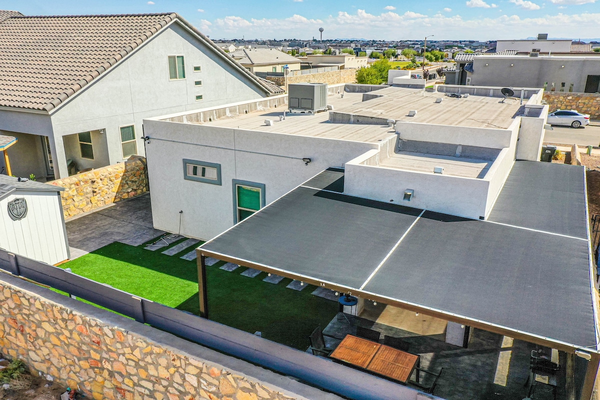 Located in a quiet neighborhood, just 25 minutes from El Paso Int'l Airport and 22 minutes to Fort Bliss, our home is perfect for military personnel, families, and travelers. Conveniently close to TX-375, Montana 62, and I-10, it offers a relaxing retreat with a luxurious spa jacuzzi, comfortable beds, a well-equipped kitchen, and complimentary Wi-Fi. Enjoy classic arcade games and a clean, well-maintained space designed for your comfort and convenience.
