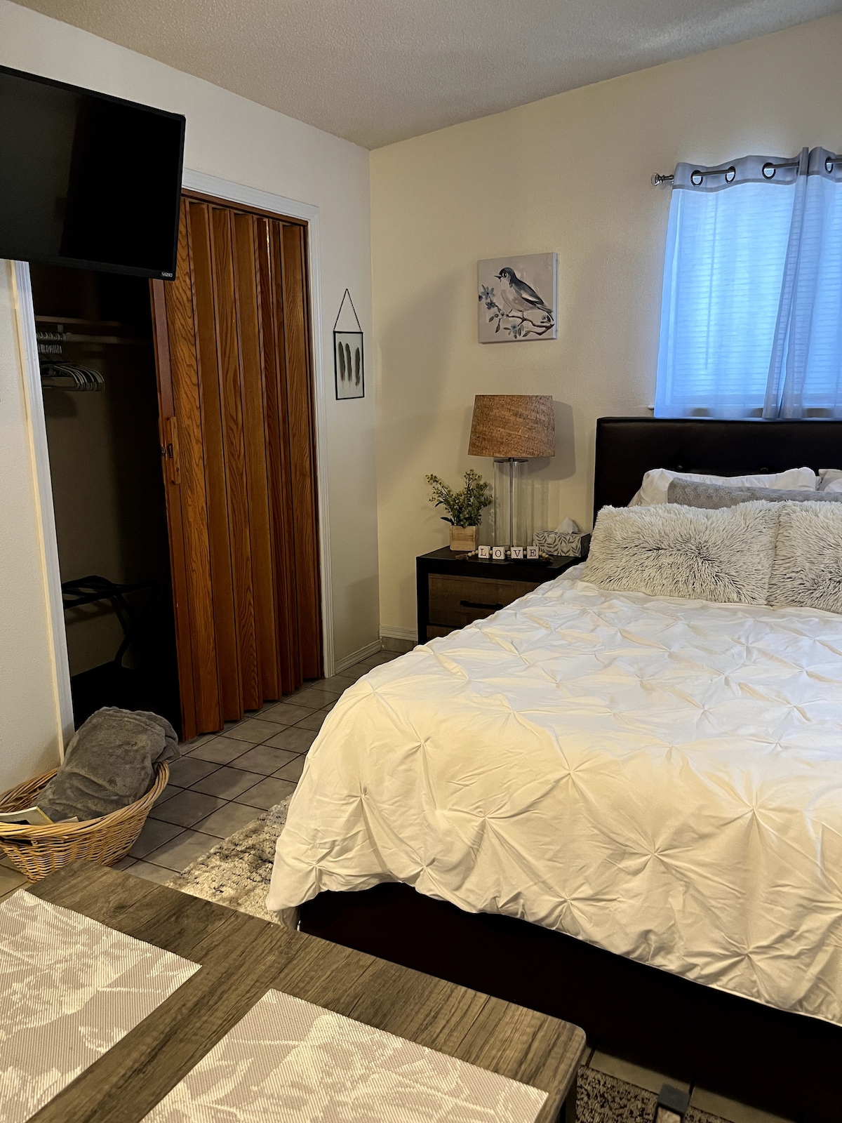 Updated studio with Full size Bed For 1 Person, Equipped Kitchen with Induction Stove, Microwave & Small Fridge, Spacious Shower Room, 43” 4K TV & Fiber Fast internet. Shared Laundry Room & Patio with a Charcoal BBQ to enjoy your evenings. Enjoy a 20% discount on stays of 28 days or more!