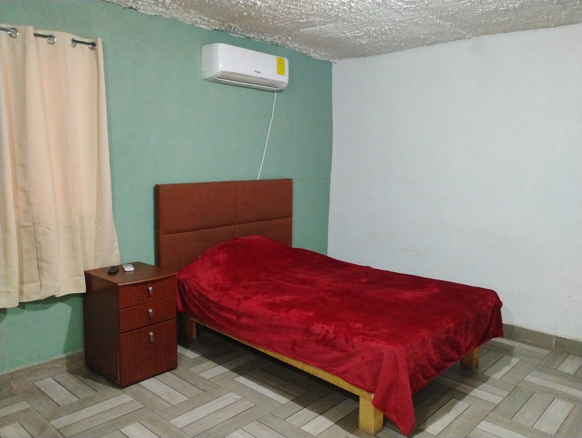 Tu familia estará cerca de Consulado EEUU, Aeropuerto, IMSS Especialidades Clinica 66, Centros comerciales, Transporte publico y Avenidas principales asi como los puentes internacionales. El area que ocupas esta totalmente separada de el resto de la casa y nunca compartes areas comunes con la familia, exepto el estacionamiento, habitaciion y terraza con baño privado y una area de snack que cuenta con micro, cafetera y frigobar, asi como algunos utensilios, clima con aire refrigerado.