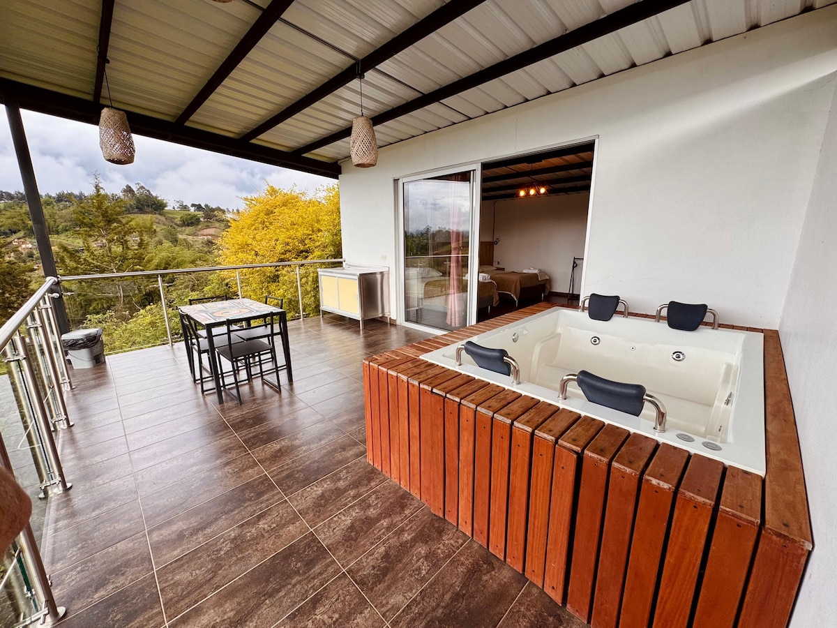 Excelente opción para familias y grupos que disfrutan estar en contacto con la NATURALEZA y la tranquilidad desde un espacio super confortable, con las mejores prestaciones y 100% privado. Cerca a todo el entorno TURISTICO. Sitio MÁGICO en las noches. Espectacular zona de PISCINA con aguas naturales de nacimiento. JACUZZI privado con agua climatizada, zona social con BBQ, WiFi de alta velocidad si deseas trabajar durante tu estadía. No apta para eventos nocturnos