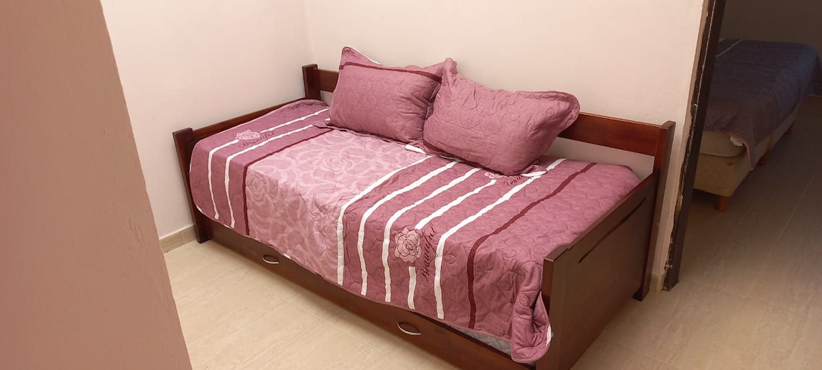Sumérgete en la serenidad de nuestra encantadora casa de campo, 2 habitaciones (1 con aire acondicionado) y un baño interior. Piscina de fibra de 1,5m de profundidad. Ideal para familias o amigos que buscan disfrutar de la naturaleza. Kiosco en el frente y asistencia cercana, estacionamiento al aire libre. Paz y tranquilidad: no eventos ni música alta. Añadiendo encanto, tres pequeñas mascotas nos acompañan: 1 gato y 2 perros. ¡Tu refugio de fin de semana te espera!