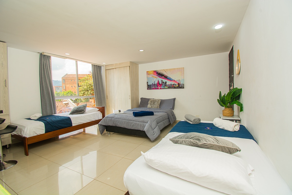 Enjoy Medellín in a beautiful loft with a strategic location in El Poblado – La Frontera, an exclusive and quiet area. 🌿 It features air conditioning, 500 Mbps high-speed WiFi, a comfortable desk, Smart TV with Netflix, a fully equipped kitchen, and a washer-dryer. Close to shopping malls, supermarkets, pharmacies, and the Linear Park La Frontera. Perfect for remote work, tourism, business trips, or long stays.