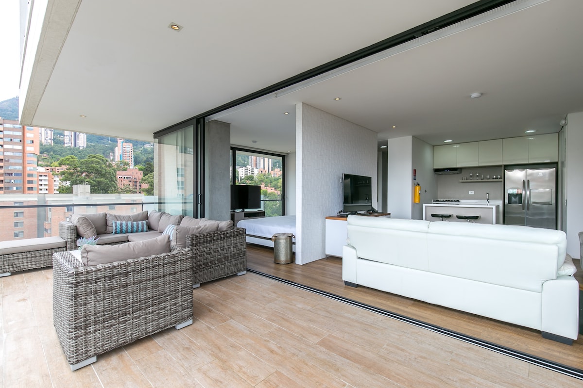 Brand new building (Hotel Urban Studios) & luxury apartment located in the best sector of El Poblado (El Tesoro), is perfect if you are looking for a peaceful and beautiful space. - Luxury interior design, furnishings - Spectacular views from Living Room, Bedroom, & Office - Full Washer & Dryer - Air conditioner In the Bedroom - 55¨Smart TVs LG - 200GB+ Wifi - Heated Pool & Jacuzzi - Steam Room - Complete modern gym - 24-hour security