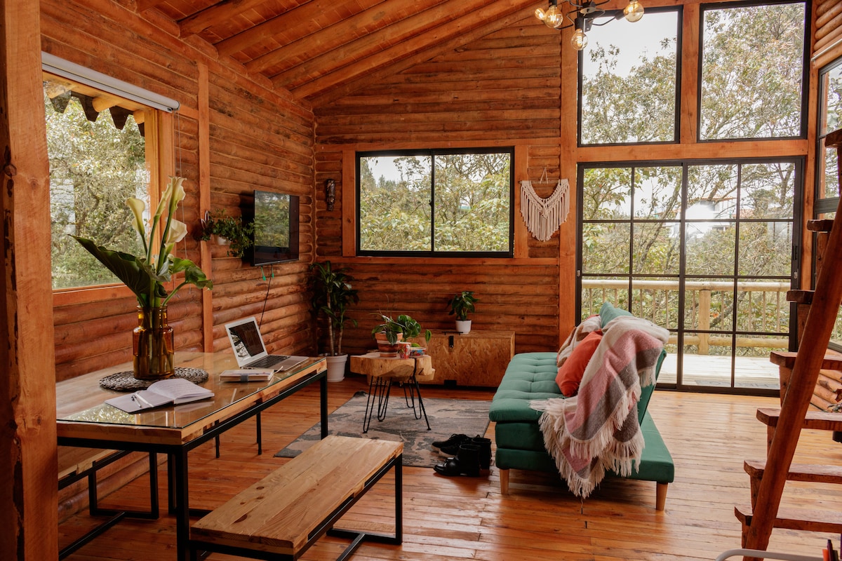 Enjoy the comfort and tranquility in a beautiful cabin next to Arvi Park fully equipped and with space for up to 5 people The view is incomparable and the air is pure. An ideal place to free yourself from distractions, enjoy a natural environment, or to work. It is the perfect spot to disconnect and enjoy gorgeous landscapes. It has fast internet 400 MB, hot water, security, and good taste! You will have cleaning service included once a week and many amenities! mountain houses tree farm trees