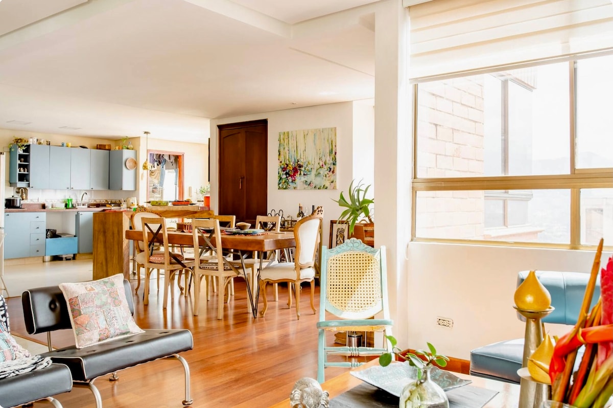 Step into this 3BR/2BA industrial-style 1990ft spacious loft with bold decor, lush green views, and standout perks like a vintage popcorn machine, projector screen, and punching bag. Located at Poblado just mins from Parque Lleras & Provenza! High ceilings, A/C at Each/Bedr, high-speed Wi-Fi, priv parking, and cinema perfect for cozy nights in. A unique stay that blends style, comfort, and fun! No visitors allowed according the building policy Next door construction occurs Mon–Sat, 7:30 AM–5 PM