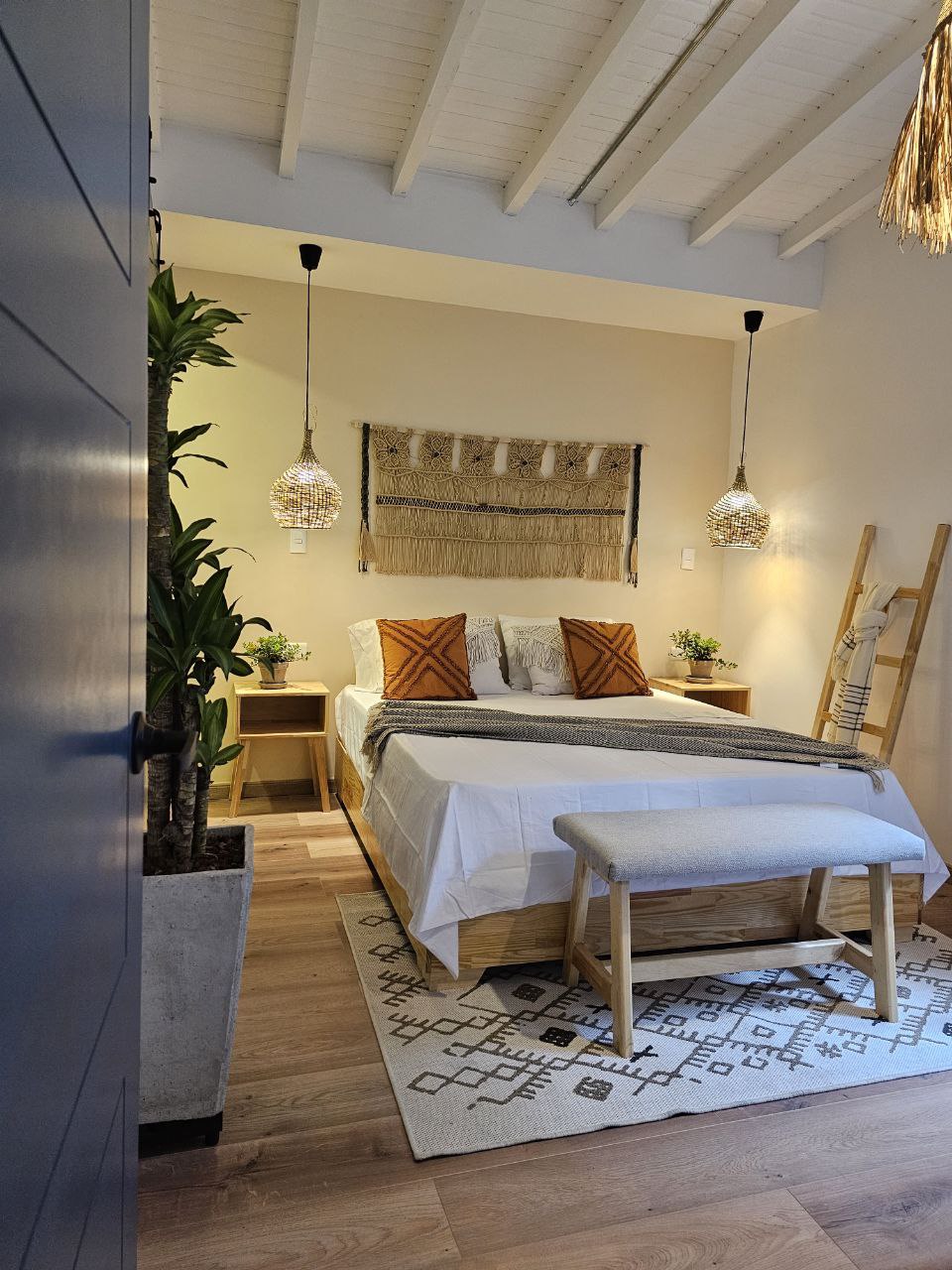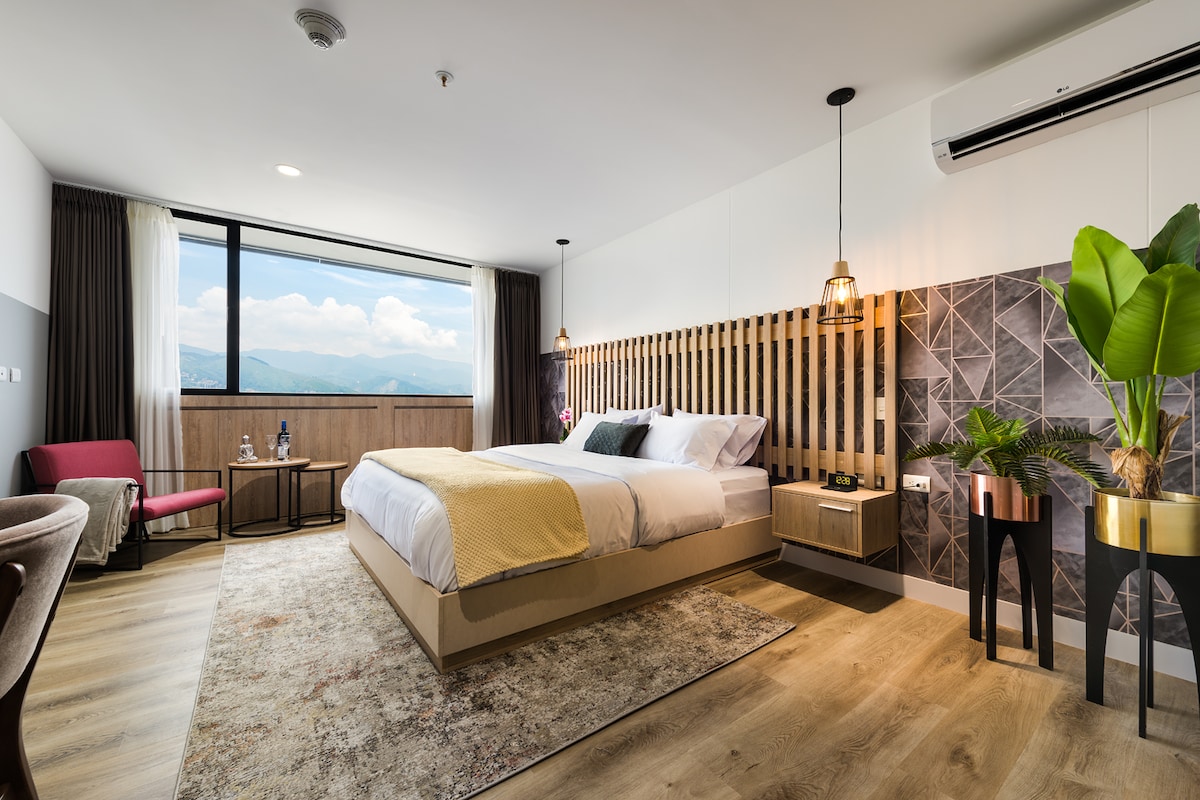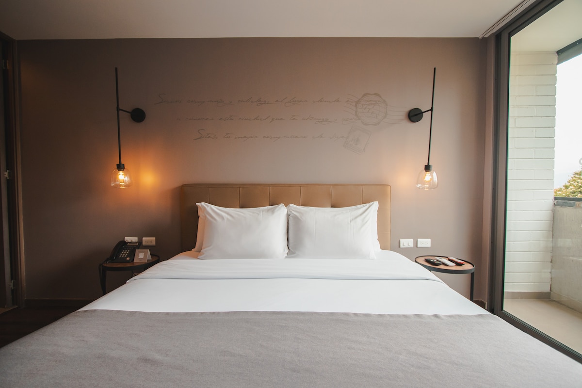 Con un amplio espacio de 23m2, cuenta con una acogedora alcoba, una zona de entretenimento perfecta para relajarte, un balcón para disfrutar de una espléndida vista, cocina equipada, un cómodo escritorio para trabajar; amplio vestier para organizar tus pertenencias, lencería de calidad y un baño completo para tu comodidad. Cuenta con cajilla de seguridad, plancha y mesa para planchado.