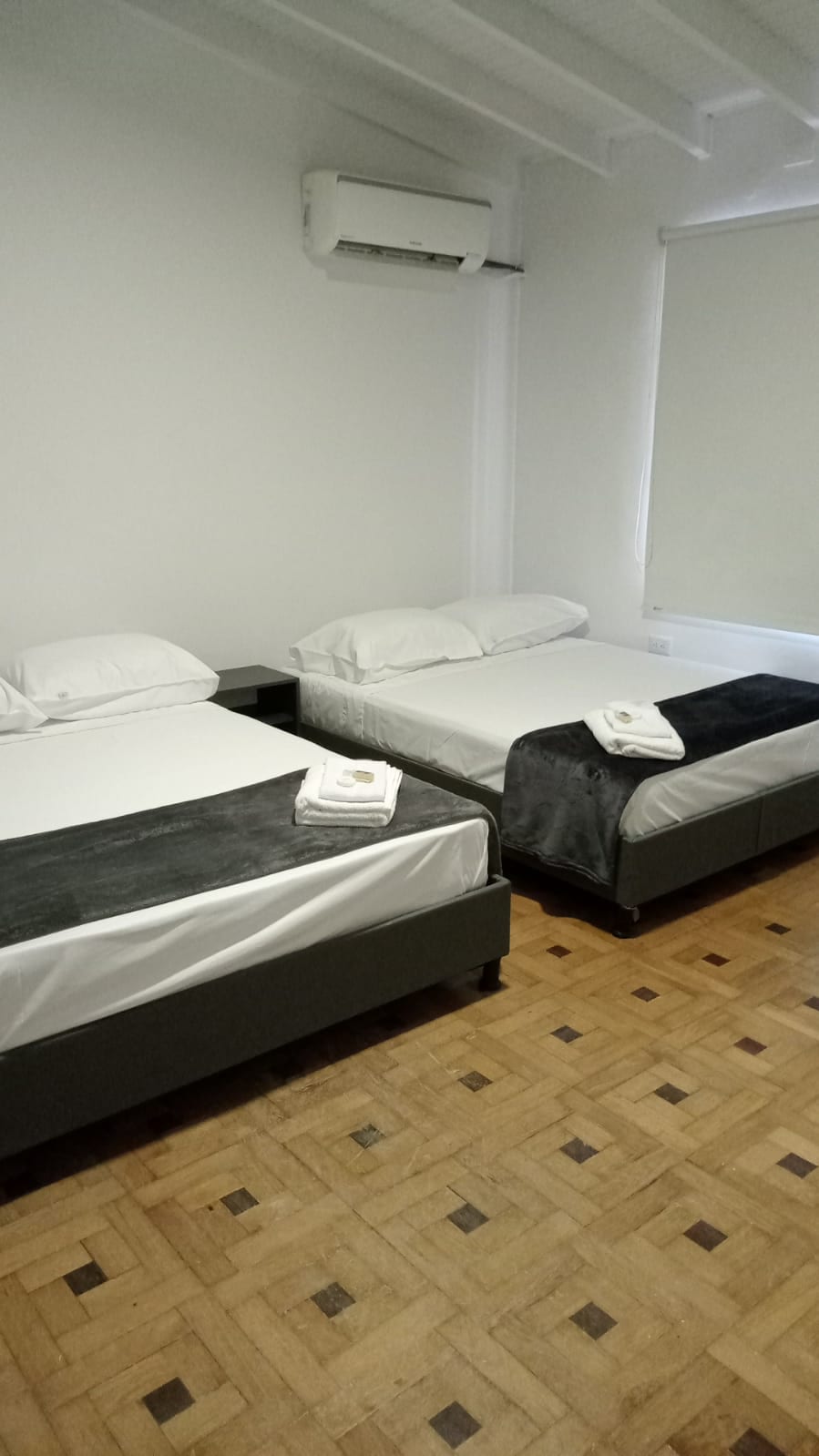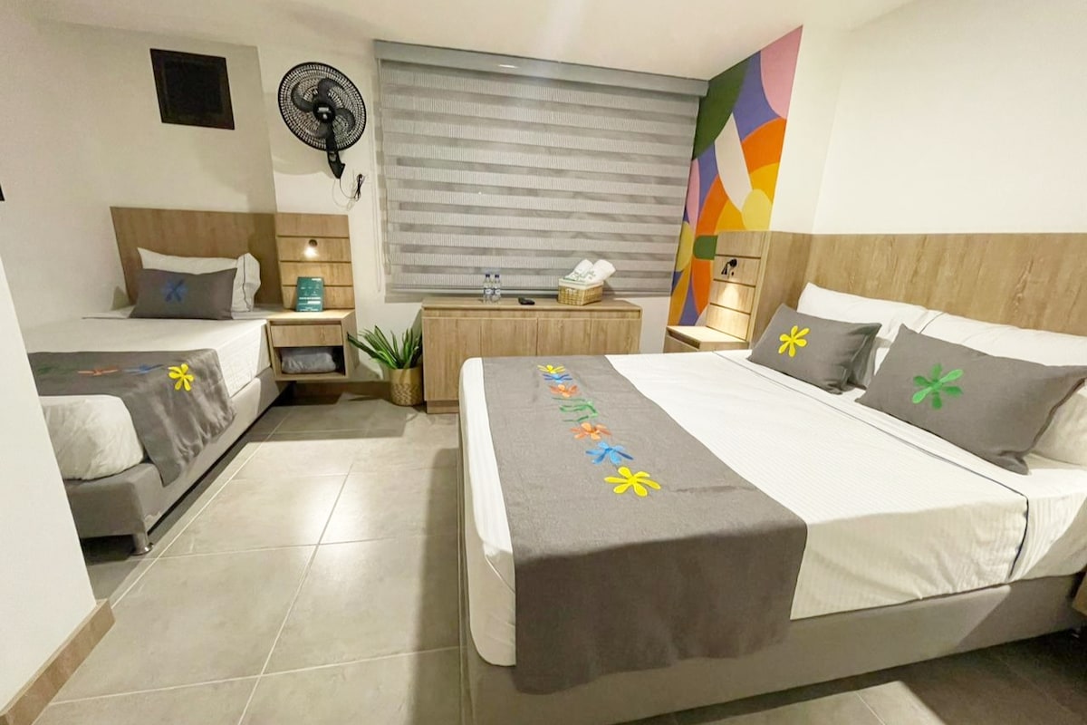 Habitación de 29 Mt2 con 2 camas queen, para máximo 4 personas. Tiene aire acondicionado, secador de pelo, plancha, baño privado con ducha, pisos de madera, caja fuerte, wifi de cortesía y muchas más facilidades. Tiene un delicioso desayuno incluído el cual tomarás en el restaurante del hotel.
