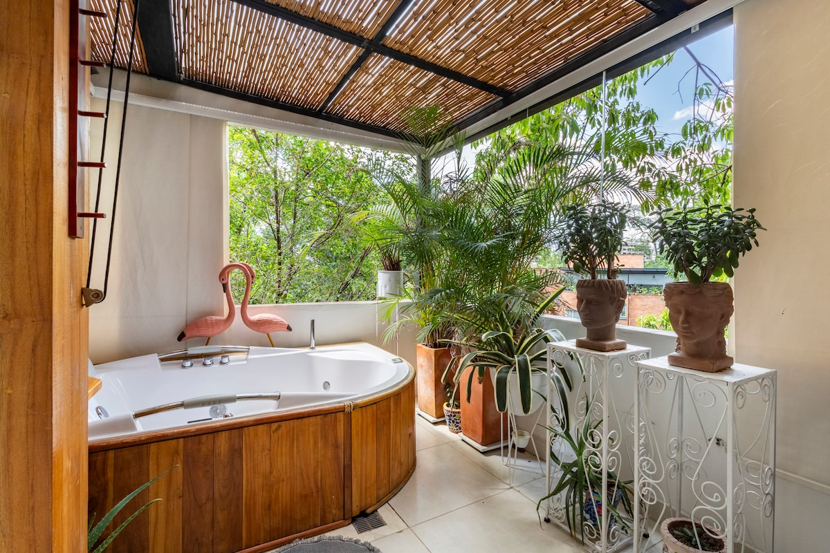 • Amazing location in heart of Poblado: "Oasis in the middle of the best part of the city, walking distance to everything” • Modern, fully furnished Loft • Sleeper sofa • High speed 100 Mb WiFi • Loads of nature around • On-site staff to help you with your needs 24/7 • Portable A/C and/or Fan. • Private Hot Tub • Pool in the common areas • Balcony w/ amazin view. • 5 mins walk to best restaurants, cafes, malls. 15 mins walk to Poblado and Lleras Park • Fully stocked kitchen • 55” Smart TV