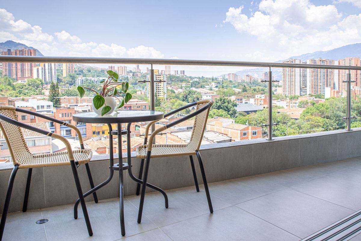 Moderno apartamento automatizado con habitación independiente, sala de estar y cocina, completamente amueblado, 200 MB de internet, aire acondicionado y espectacular vista a la ciudad. El edificio está ubicado en el mejor barrio de Medellín, El Poblado, cerca de la Universidad EAFIT, la Milla de Oro, centros comerciales, supermercados, restaurantes y la estación Aguacatala del metro. Cuenta con zona de coworking, café, gimnasio y vigilancia las 24 horas.