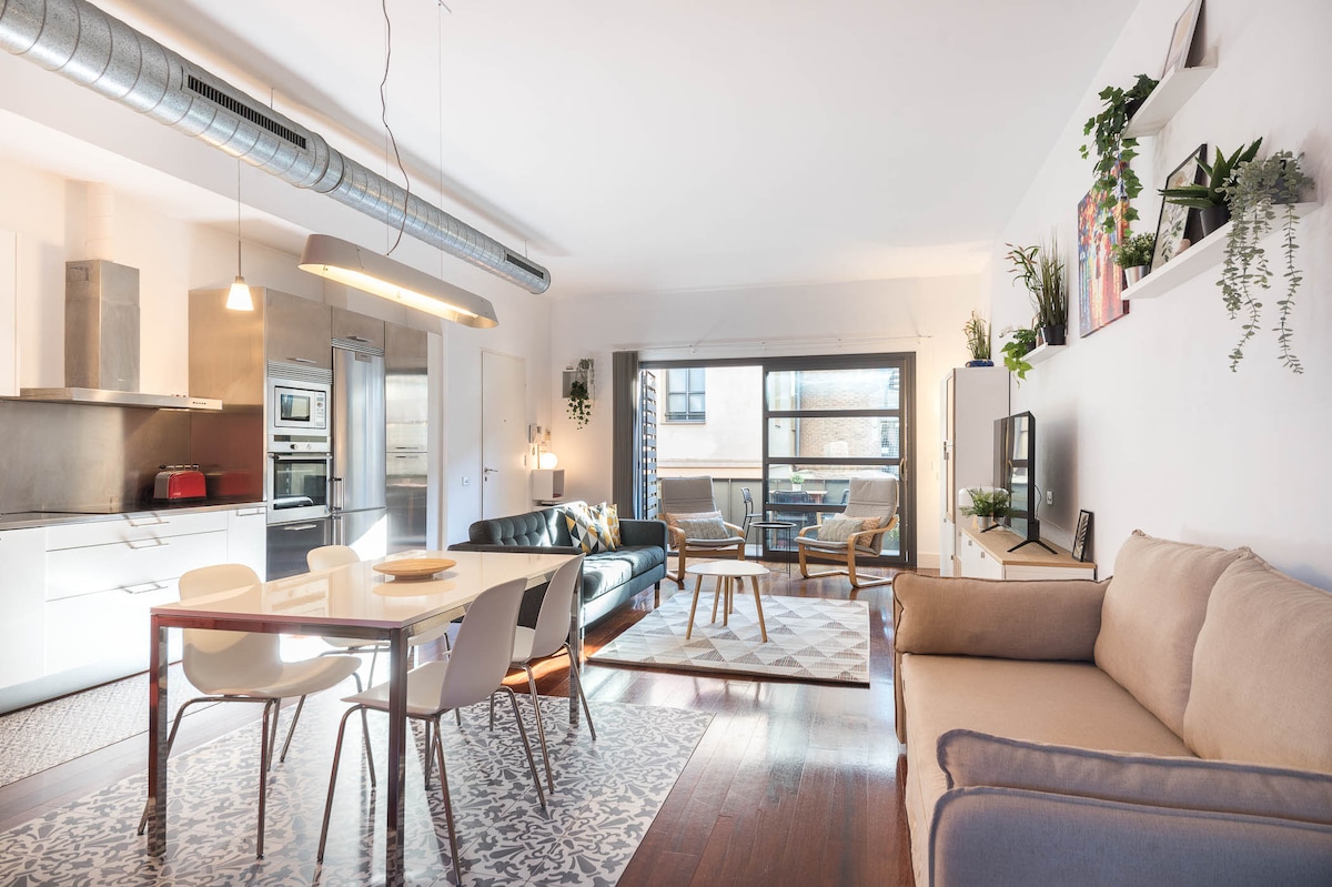 The loft was here before we moved in. It is one of the oldest buildings in Poblenou. The apartment was transformed into a big open space that includes a kitchen, a dining area, a sofa, a TV, an office space, and the bedroom.