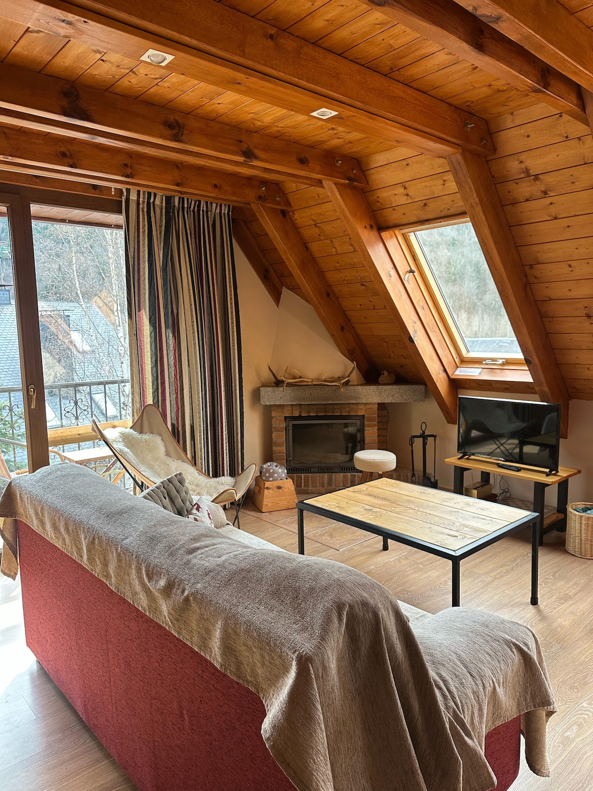 Luminoso dúplex abuhardillado en el centro de Vielha. Con plaza de PARKING y PISCINA en Julio y Agosto. Con orientación sur y unas vistas despejadas a la montaña. Cálidos acabados de madera. Espacio preparado para un máximo de 4 personas (cama doble + sofá cama doble) ideal para parejas, familias o pequeños grupos que quieran disfrutar de la montaña, el senderismo, las pistas de esquí o la gastronomía del Valle. No olvides que tu mascota es bienvenida como uno más de la familia.