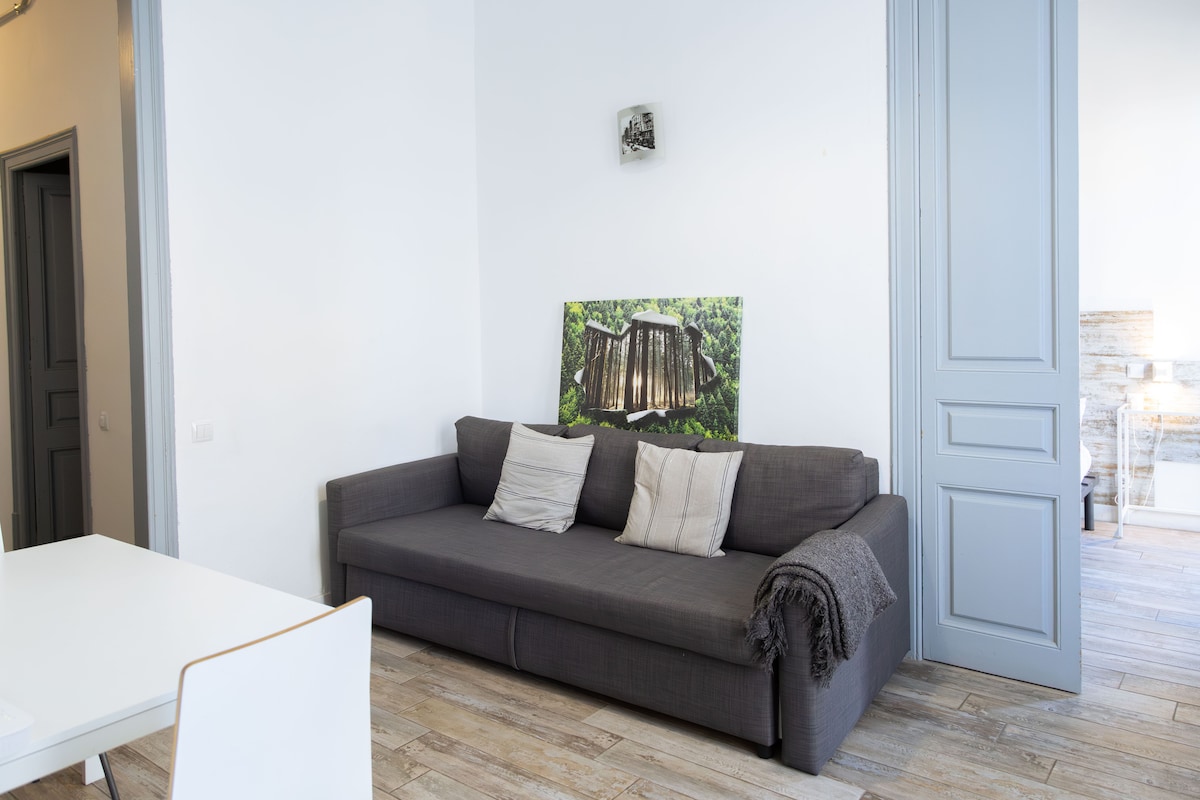 Fully equipped, newly renovated Nordic-style property with: a double room, dining room, living room with comfortable sofa bed, full bathroom and fully equipped kitchen. Large floor-to-ceiling window with natural light all day SMART40’TV, NESPRESSO coffee machine, kettle, complimentary capsules & tea, HIGH-SPEED INTERNET optic fibre, A/C, washer & dryer machines, dishwasher. 1,8x2m KING-SIZE BED, top-quality mattress, SOFA BED for the 3rd-4th person. Available extra floor mattress for 4th person