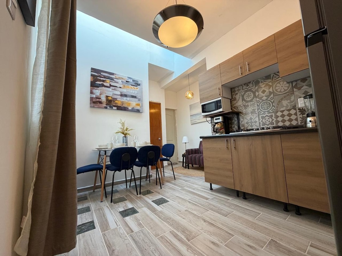 Beautiful suite Boutique concept furnished with antique touch but fully equipped. Heart of the historic center. Beautiful apartment located on pedestrian street in the best location in downtown w/ amazing private rooftop terrace. The apartment sleeps 2 people is fully equipped with private bathroom, kitchen and dining area. Walking distance to everywhere in downtown Queretaro. The place is clean quiet and full of design. Nice terrace Safe box Bathroom Queen size bed Dining room Living room 49