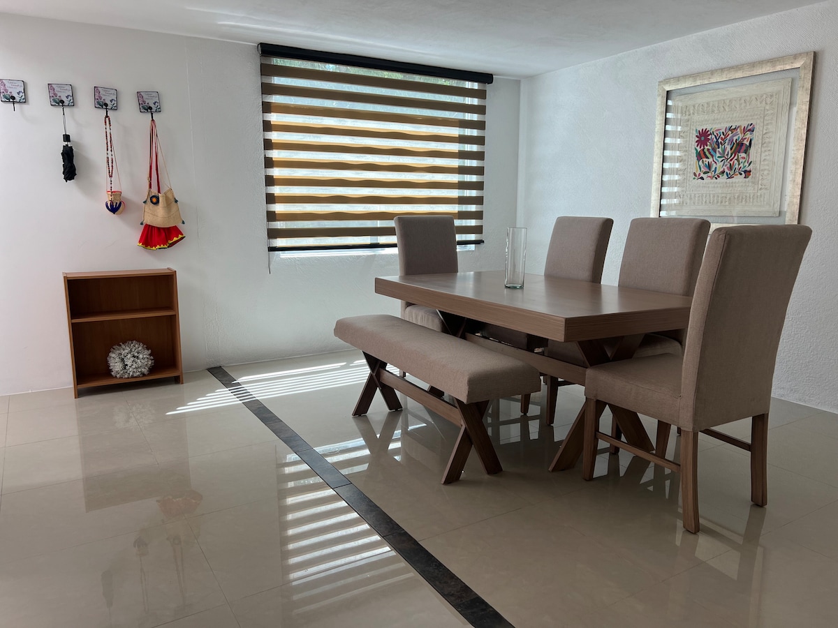 Departamento nuevo y moderno con acabados de lujo, con dos recamaras con cama matrimonial y closet cada una. *La televisión (chica) de la recamara principal (1) sólo cuenta con YouTube y Netflix, la televisión (grande) de la recamara 2 cuenta con VIX, Netflix y YouTube. Cocina y comedor. Es una zona tranquila y segura, ideal para pasar unos días fuera del ruido de la ciudad. El departamento se reserva completo. Para trasladarse hay servicio de transporte público, Uber y taxis.