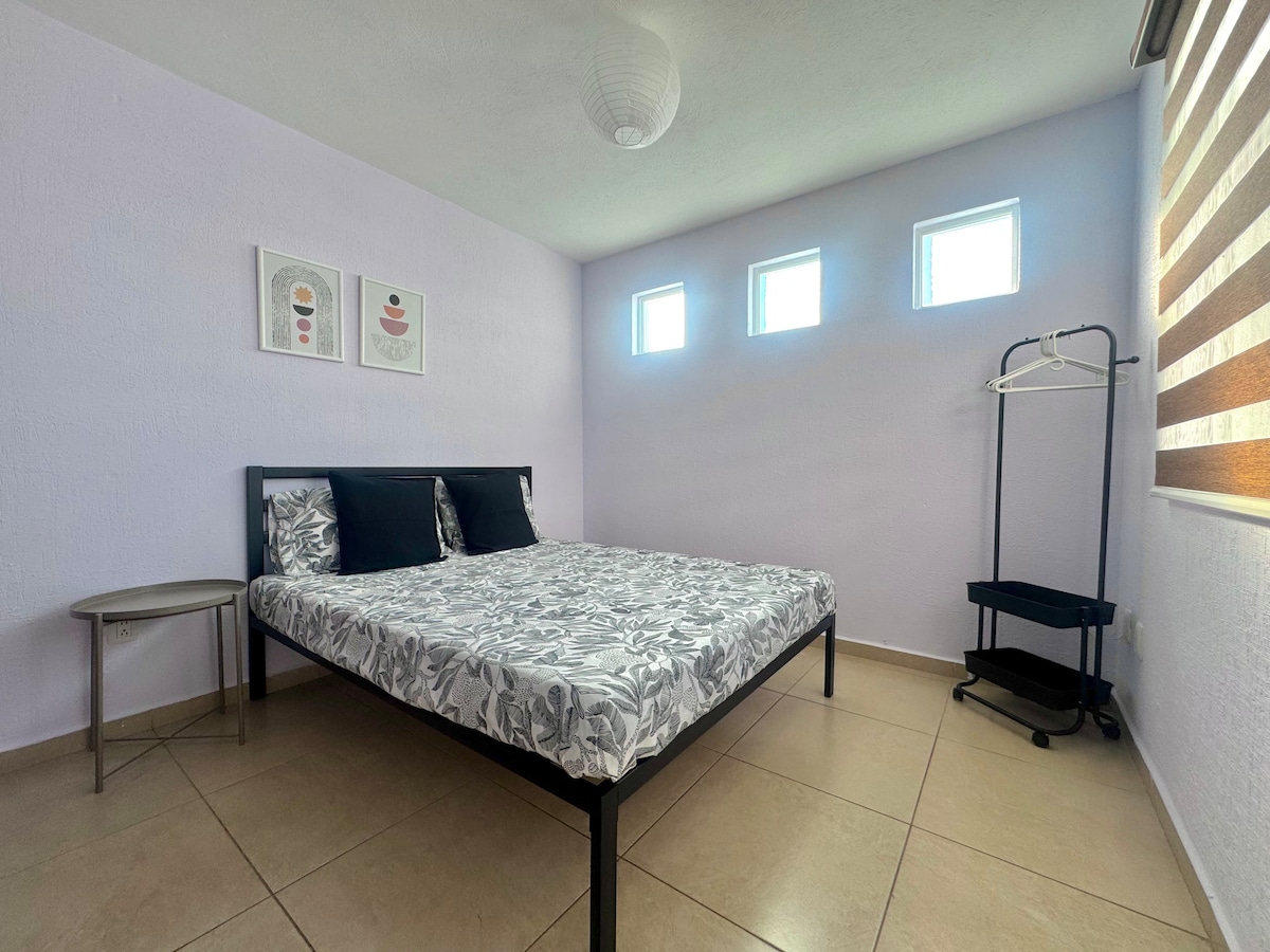 Departamento completo ideal para disfrutar tu estancia en Qro. Habitación muy amplia, cuenta con mini split, TV, clóset, 2 silloncitos y espejo de cuerpo completo. La cocina está equipada con: parrilla eléctrica, microondas, licuadora, cafetera, refrigerador, vajilla para 4 personas, y accesorios básicos para uso de la cocina. 1 baño completo (se utilizan paneles solares para el agua caliente), incluye: jabón para manos, shampoo, jabón corporal, toallas, secadora p/cabello y plancha p/ropa