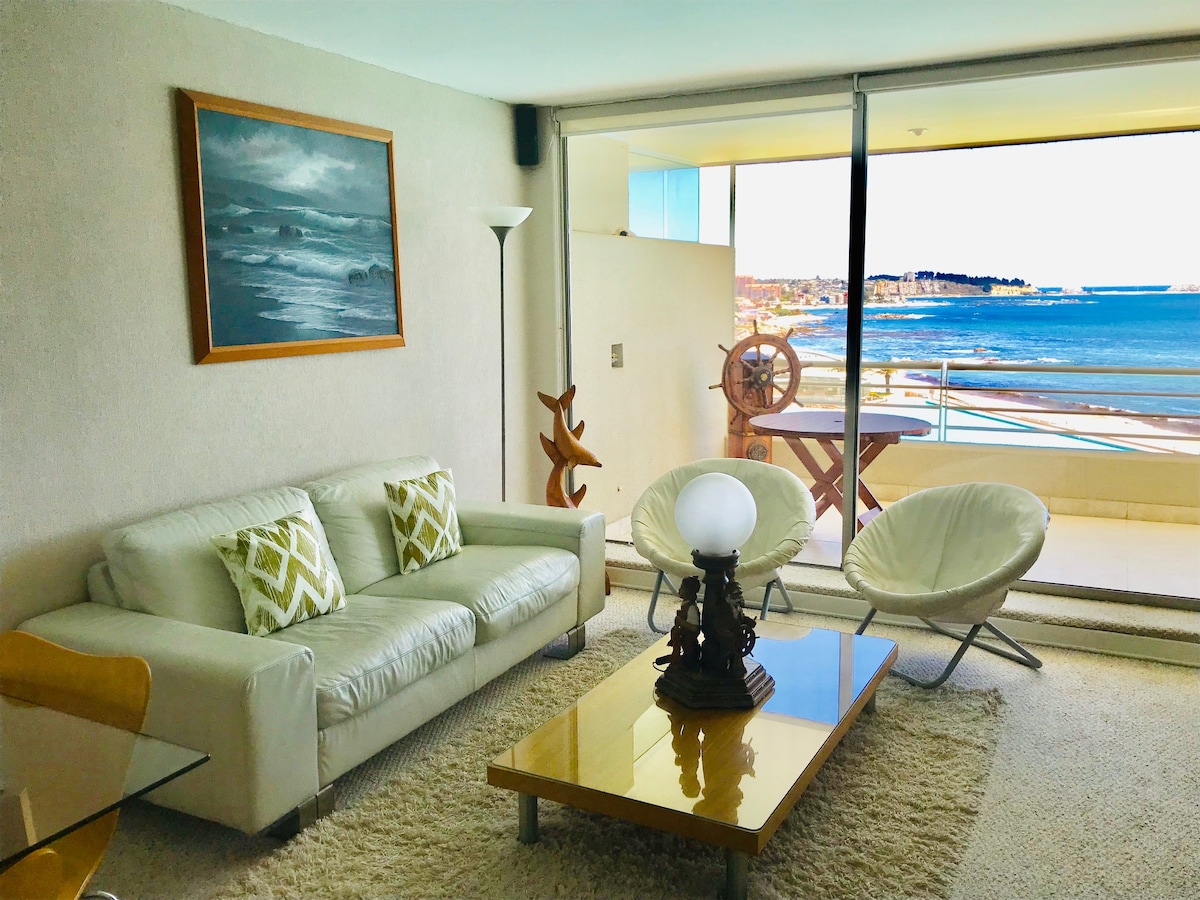 Our modern and nicely decorated apartment has a very edgy look yet a warm and cosy feeling. In front of the best beach in Algarrobo with a beautiful emerald color, a small conifer forest and white sands. Walking distance from a grocery store, beach, restaurants, etc. only 40 minutes to Beautiful and World Heritage Valparaiso and Viña del Mar. Only 15 minutes to the House-museum of Pablo Neruda. 30 Minutes to the closest Winery or Vineyards.