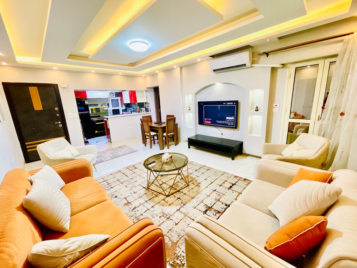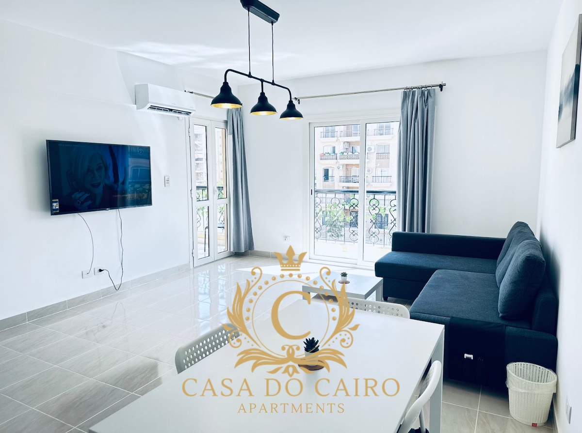 Welcome to Kemetland! Sky High Harmony - the newly renovated fully furnished apartment. Enjoy modern elegance, complete AC, and comfort. Stylish living area, fully equipped kitchen, and dining space. Our apartment located in a very prime location (Rehab Compound) which is nearby attractions, shops, and dining options. - Near Gate 20 & 21 - 5 minutes walking to Rehab Bus stop - High-speed internet - 20 mins from airport Book now for a delightful stay!