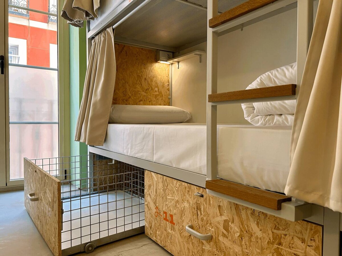 The Loft House Madrid Lavapiés Cama en dormitorio femenino con luz natural. Literas de 2m de largo. Cada cama tiene su luz personal, enchufe, usb y balda, cortina blackout para mayor privacidad y un amplio cajón individual que se puede cerrar con un candado que se puede alquilar en recepción. Disponen de: Aire acondicionado Calefacción WIFI de alta velocidad Baños y duchas compartidos en el pasillo Manta Sábanas Toallas (extra con suplemento y bajo petición)