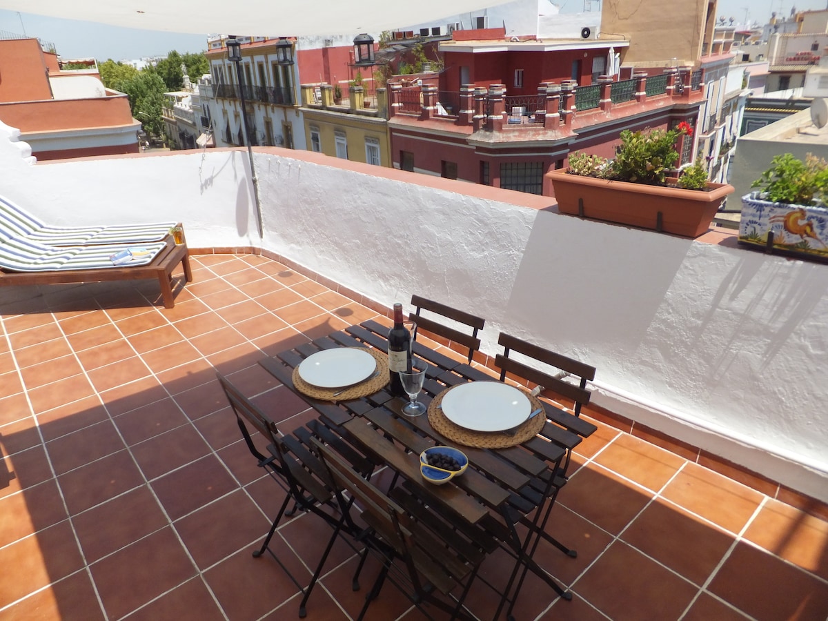 This penthouse boasts a large, private terrace with stunning views. It's located in the historical centre of Seville, next to Europe’s oldest public square, La Alameda de Hercules, where an eclectic array of dining and entertainment is offered. It is a bright and airy space which has been newly renovated and refurbished. It has a double bedroom, open-plan living room and fully equipped kitchen. There is WiFi, A/C and ELEVATOR.