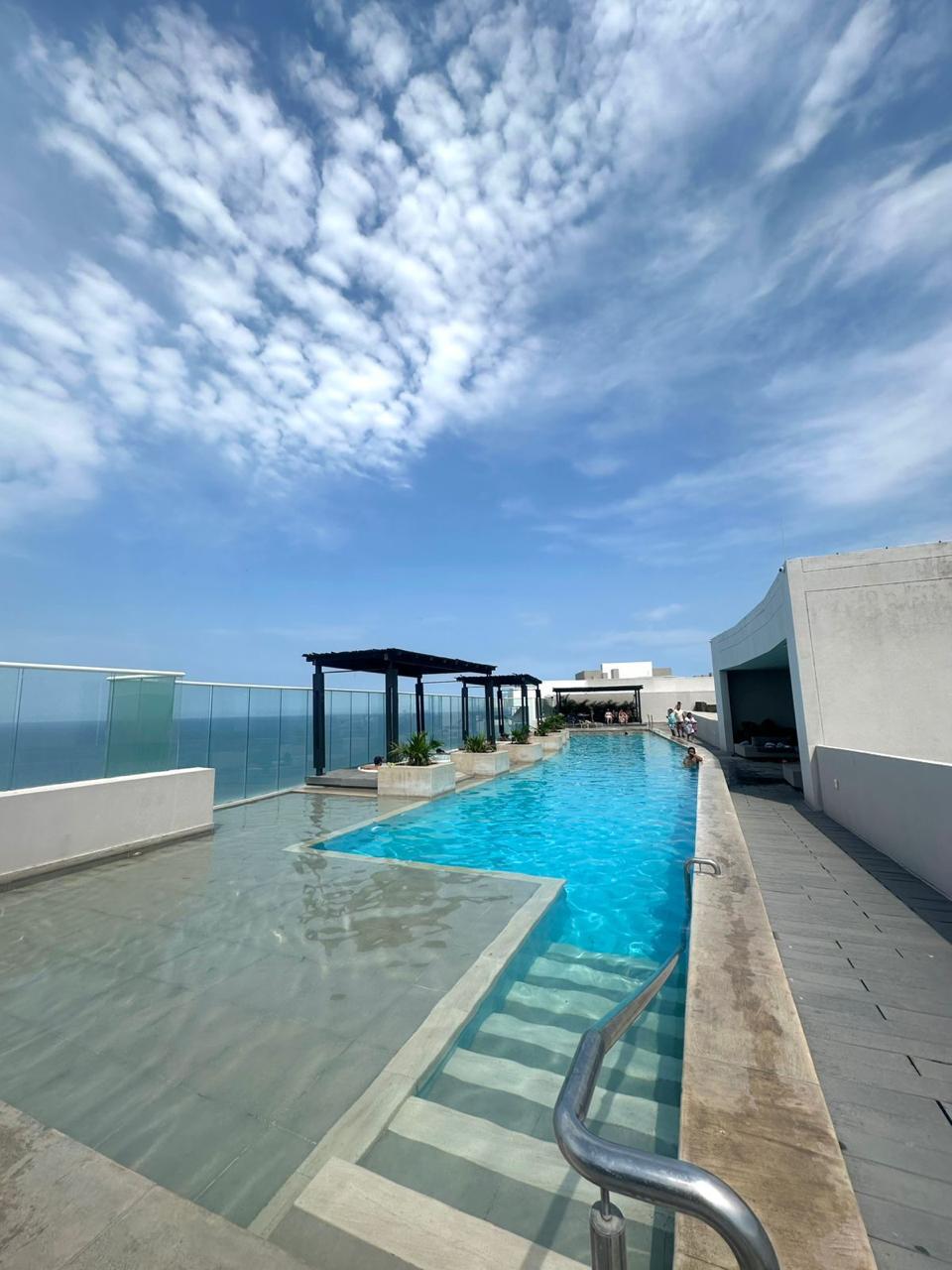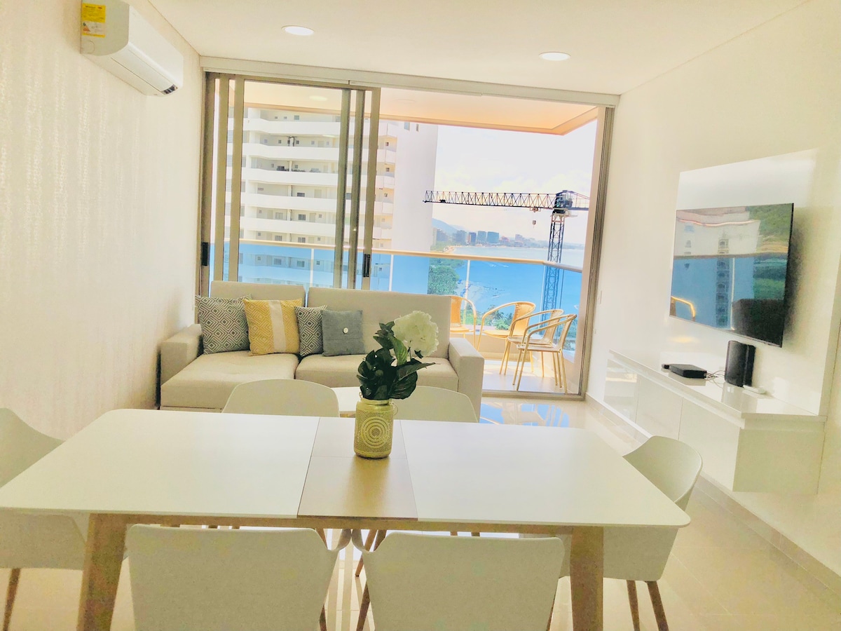 Espectacular apartamento moderno para estrenar en un piso 17 con vista al mar y salida directa a la playa. Espacio agradable para tomar vacaciones, descansar y/o trabajar home office. A 10 minutos del aeropuerto internacional y del centro histórico de Santa Marta, cerca a zona de restaurantes, bares, centros comerciales y farmacias. A menos de una hora del Parque Nacional Tayrona, Taganga, Minca. El apartamento cuenta con un amplio balcón donde podrás disfrutar del mejor atardecer de Colombia.