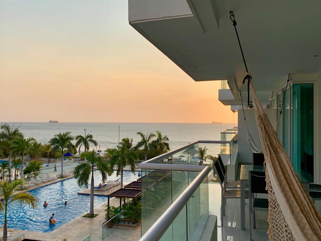 Stunning and luxurious sea view apartment in an exclusive urban beach in Bello Horizonte, Santa Marta. Just 8 minutes from the Airport or Zazué Mall, but far from the hectic city center and crowded Rodadero – it seriously can't get any better than this! You will enjoy 2 huge swimming pools, a private & public beach, snack bar, children's area, or simply appreciate the spectacular sunsets from the balcony. (Please note: The hammocks have been removed and are no longer available.)