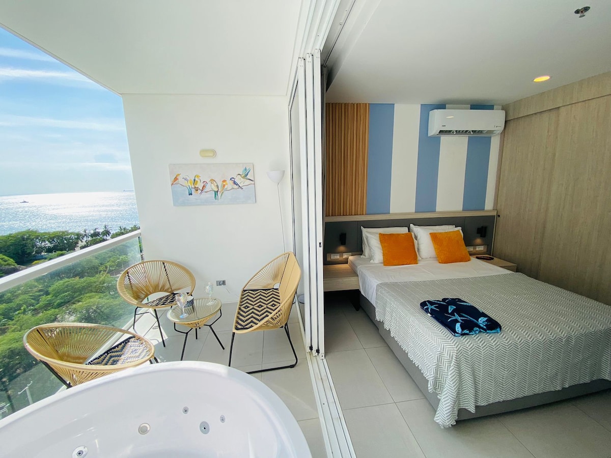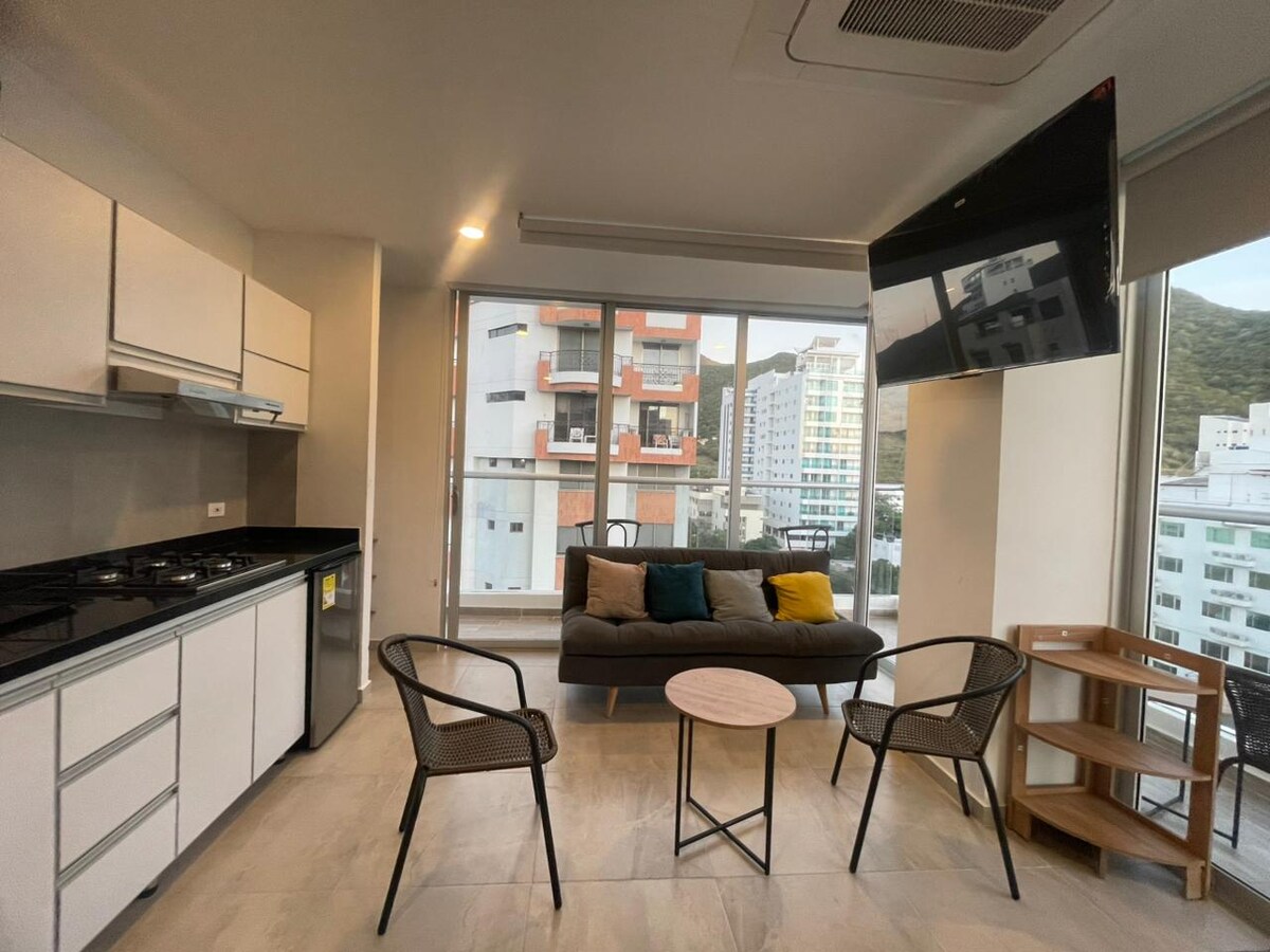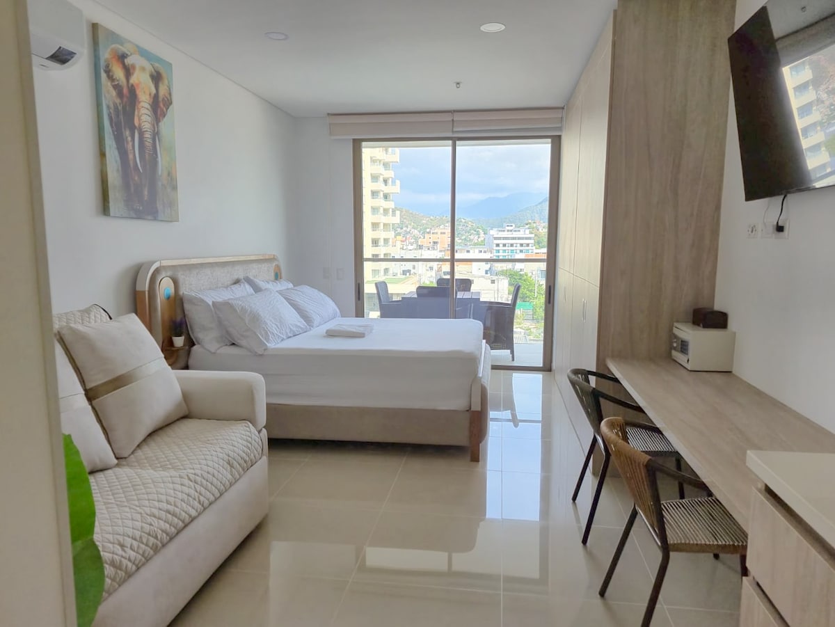 Moderno apartamento tipo loft con vista al mar a solo 100 metros de la playa en el Rodadero. Perfecto para 1-3 huéspedes con cama amplia, sofacama, cocina equipada, espacio dedicado para trabajar y baño de diseño moderno. Incluye increíbles amenidades: piscinas para adultos y niños, gimnasio completo, sauna y zona de BBQ. WiFi de alta velocidad incluido. Ubicación privilegiada cerca de restaurantes, zona comercial y atracciones turísticas. ¡Tu escape perfecto en el Caribe colombiano!