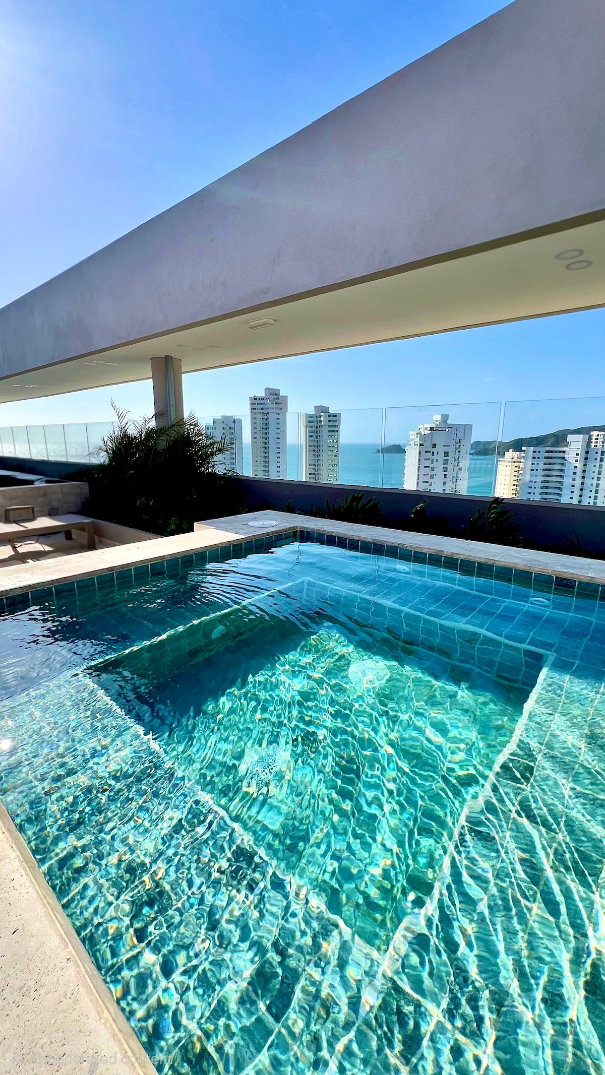 Welcome to Santa Marta! Enjoy your stay at this centrally-located, brand new, beautiful, and peaceful apartasuite. In our apartment you will find a queen sized bed and a double sofa bed. Desk/work space for working remotely. Fully equiped kitchen and laundry room. Homey and beautiful decorations that will make your stay unforgettable. Wonderful ocean view from the pool area located on the 15th floor. Located in the Rodadero, only a few minutes walk from the beach.