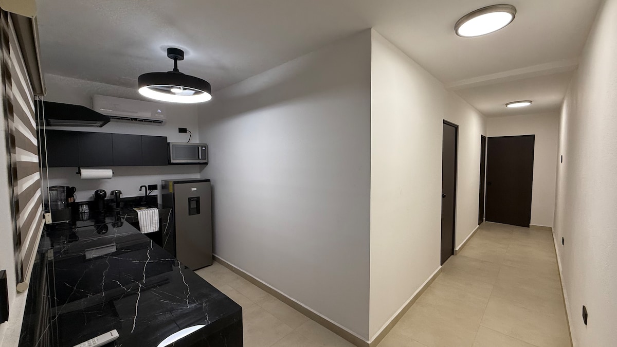 Departamento a 10 minutos del aeropuerto, estacionamiento cerrado. 2 habitaciones: Camas queen Aire acondicionado Ventilador de techo Smart TV Mueble para abrir maletas Cocina: Parrilla de inducción Refrigerador Microondas Campana Tarja Licuadora Tetera Cafetera Nespresso(con 4 cápsulas) Sartenes y olla Vajilla Utensilios Cubiertos Aire acondionado Baño: Agua caliente Toallas Shampoo Acondicionador Jabón líquido corporal Secadora Plancha