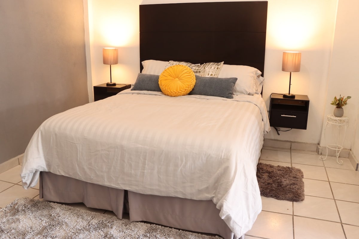 Tu familia estará cerca de todo si te hospedas en este alojamiento céntrico. A un paso de la carretera transpeninsular la cual es la carretera que te lleva al aeropuerto o a Cabo San Lucas, sobre calle principal comercial Manuel Doblado, caminando a 10 minutos de la Mision de San Jose del Cabo. Ideal para parejas con un hijo, cama queen en donde caben 2 personas. Estacionamiento gratuito en la calle.