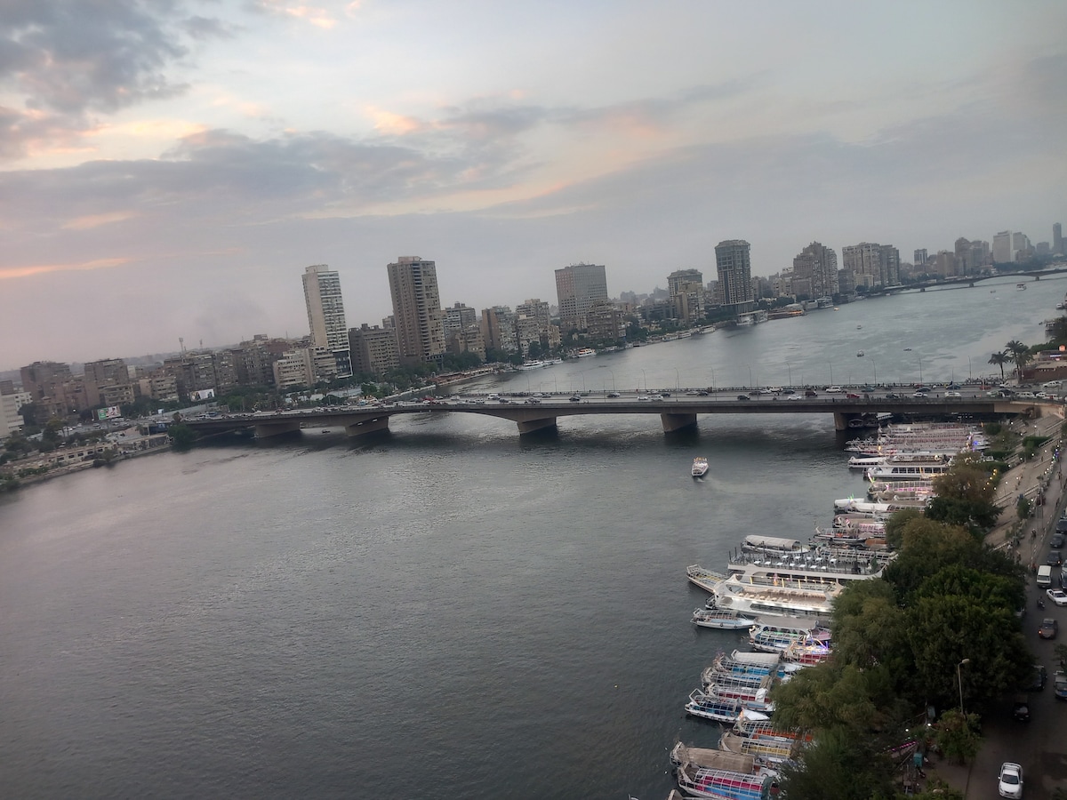 Luxury Apartment with Panoramic Nile View in Cairo This large apartment offers stunning Nile views, 3 comfortable bedrooms, 2 bathrooms, and a balcony with a coffee corner. All rooms are air-conditioned. Equipped with a smart TV, a fully stocked kitchen, and more. Perfect for families or individuals looking for a relaxing stay in Cairo. Surrounded by all daily essentials.