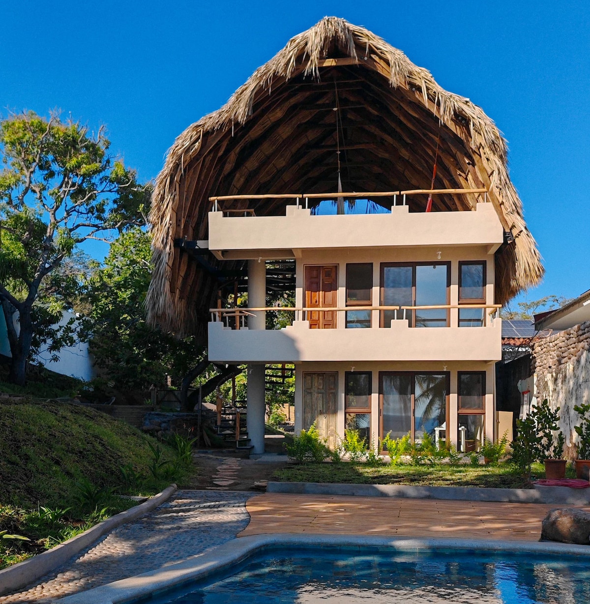 Wake up to sweeping ocean views at this peaceful guesthouse in the gated Cerromar community of Sunzal, part of Surf City. Perched high above El Tunco and El Sunzal, this breezy cliffside retreat is ideal for couples or solo travelers looking to unplug, recharge, and take in the scenery. Lounge by the private pool, relax in a hammock, or head down to the surf breaks and beachside cafés just a short drive away.