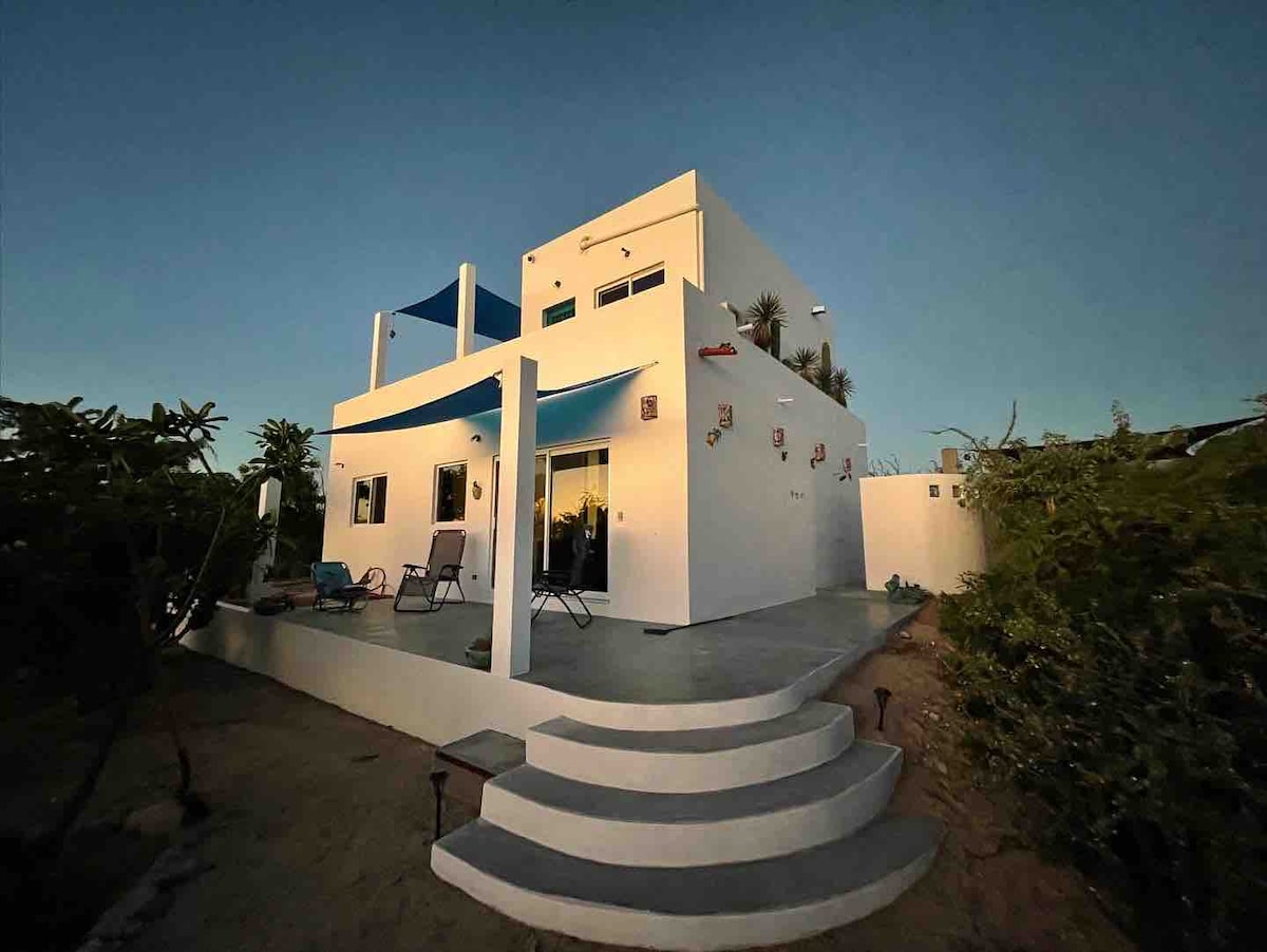 Disfruta de la sencillez de este alojamiento tranquilo y céntrico. Este alojamiento es especial porque fue diseñado pensando en los amantes del mar, el viento y la tranquilidad. A solo 5 minutos caminando de la playa y Playa Central, esta casa nueva combina comodidad moderna, conexión confiable con Wi-Fi satelital Starlink, y un ambiente relajado con vistas espectaculares a la bahía y el desierto.