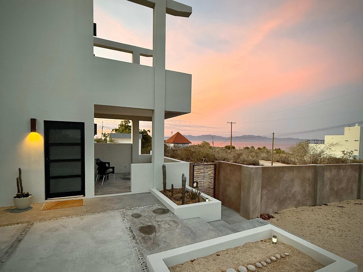 Your eco-chic paradise facing the Sea of Cortez. This sustainable home offers two bedrooms (king and queen), sofa beds, hammocks, and a private pool. It features a full kitchen, workspace, fast Wi-Fi, and a TV. Enjoy a terrace with lounge chairs, a fire pit, a grill, and a kayak. Direct beach access, free parking, and 24/7 security. Experience unique sunsets and responsible comfort: book your coastal escape now! Premium bedding, flexible check-in, and personalized attention to your experience.