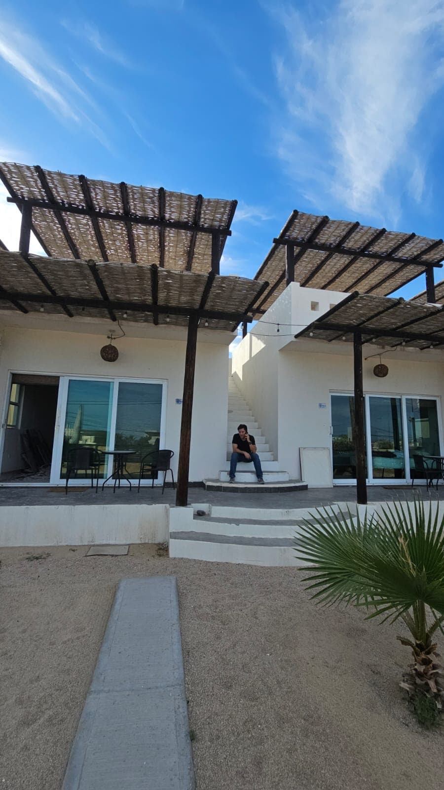 A cozy eco-retreat 2-bed, 1-bath with a full kitchen, breakfast bar, and living room that opens to a spacious furnished terrace, pool, fire place and epic sea views. Enjoy morning coffee, lively dinners, lounge on the terrace, dip into your private pool, and wake to sunrise views. A Quintessential Baja Experience of barefoot comfort and ease. Close enough for adventure, far enough for rest, just 7–10 minutes to town, beaches, kitesurf, sea safaris, cafés, hot springs, MTB. Fast Starlink WiFi.