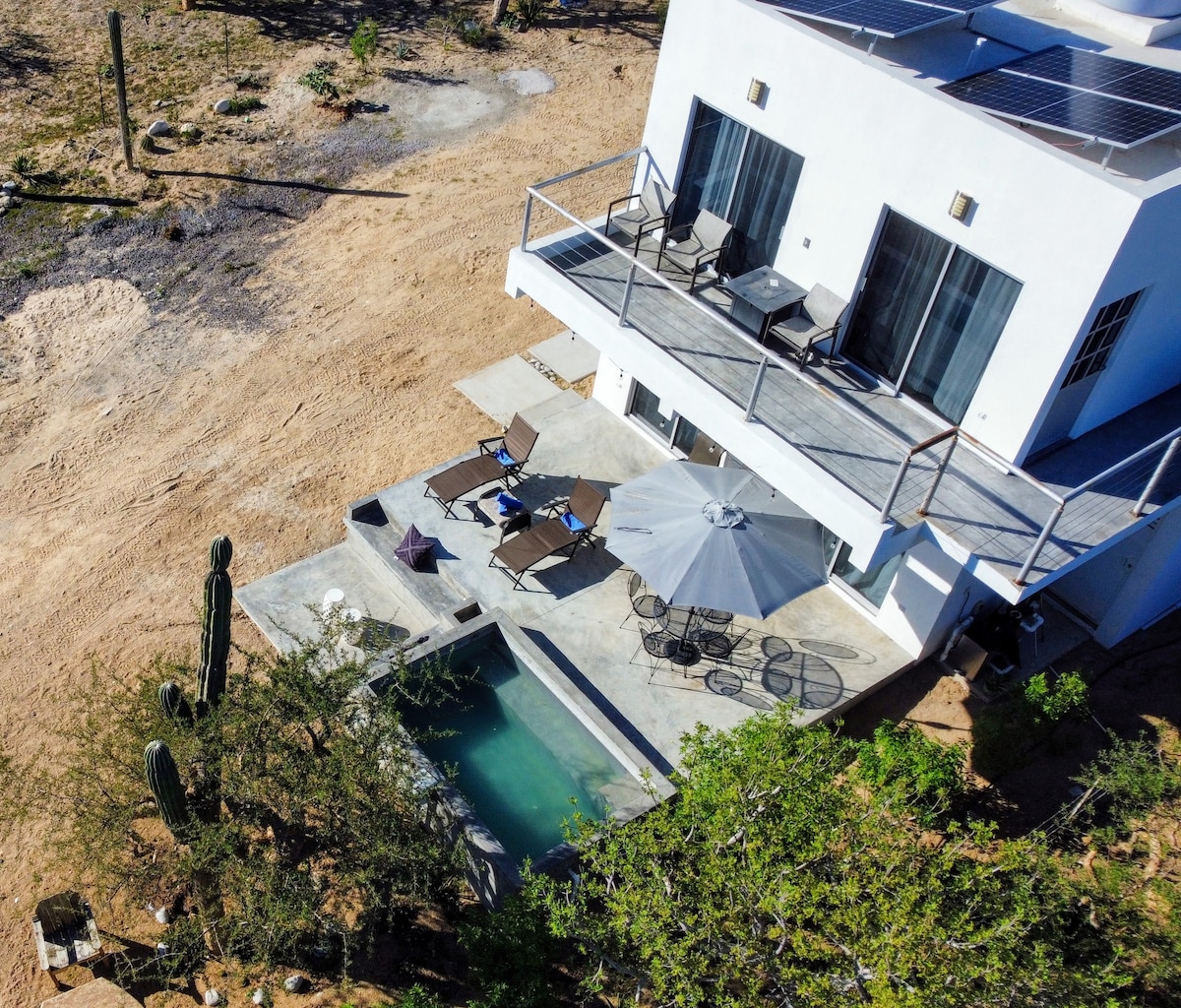 Magnifico lugar para relajarse y descansar, muy cercano a lugares como La Ventana, El Sargento, Punta Arena y Ensenada de Muertos, reconocidos por el Kite Surfing, la pesca y el buceo. Un lugar muy tranquilo, sin ruido, con un clima excepcional y un cielo estrellado. Desde la terraza de la cabaña se puede apreciar una vista fascinante hacia la Bahía de La Ventana en el Mar de Cortez. Un lugar alternativo como estancia para la zona de La Ventana y El Sargento, en la parte alta de la zona.