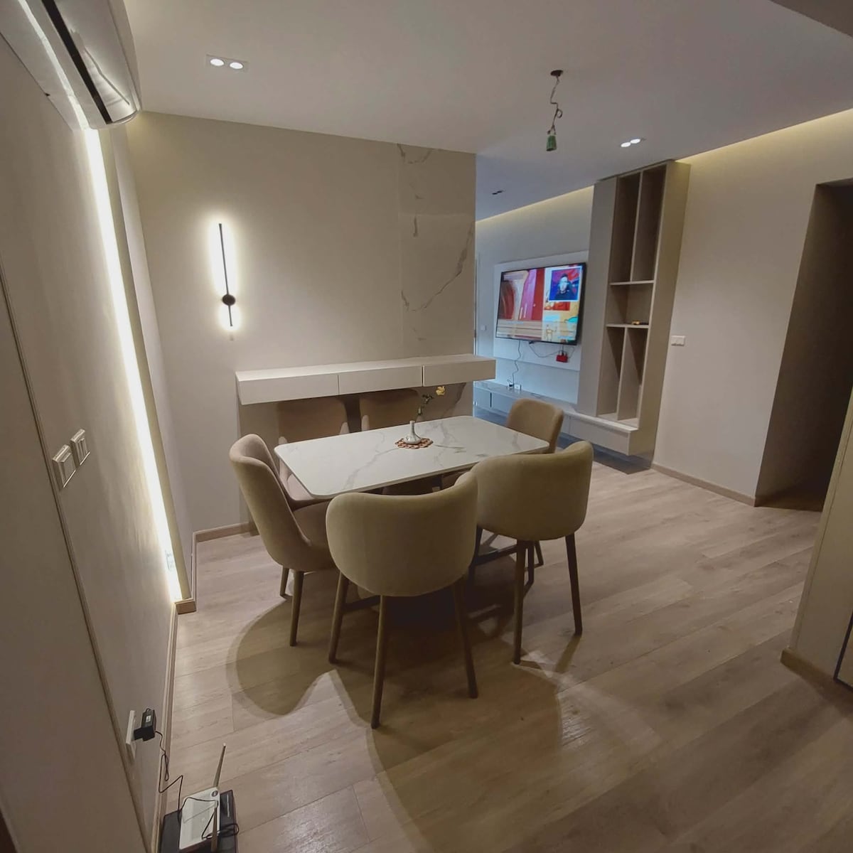 Stay in our stylish 3-bedroom apartment (110 sqm) designed in a soft industrial style. Features 1 queen bed, 4 single beds, a spacious living area with sofa, armchairs, coffee tables & a swing. Enjoy a fully equipped kitchen (fridge, stove, washer, filtered water), dining table for 6, and a modern bathroom with shower & hair dryer. Relax with a 55" Smart TV & free WiFi. Includes free parking. Perfect for families & groups seeking comfort and design.
