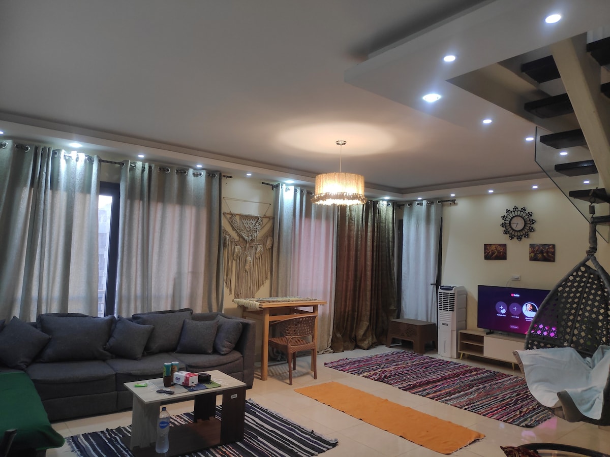 An economy option yet cozy, stylish and hygienic. A furnished apartment in Sheikh Zayed city, Egypt where there are no crowds and quality services are available everywhere. The apartment is located in a medium class local residential building only 30 minutes away from Giza Pyramids, the Egyptian Museum and other monuments. It's also surrounded by a lot of marketplaces, shopping malls and close to everything you need.